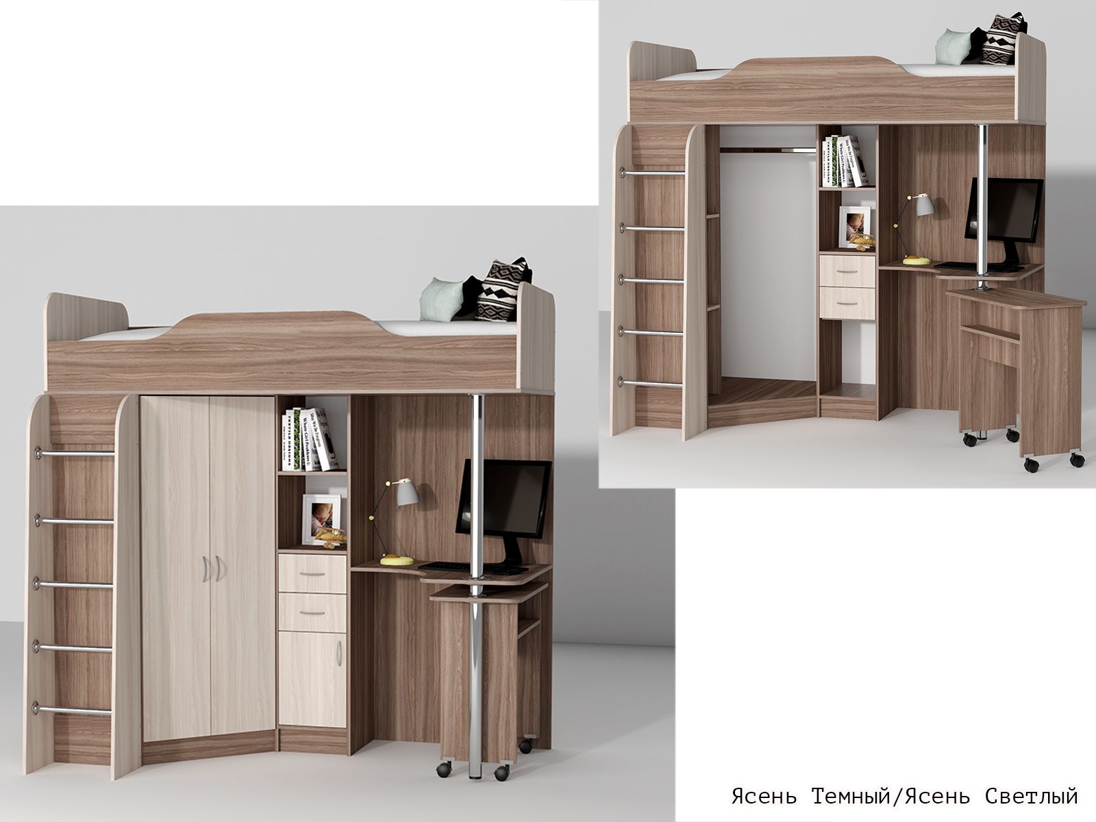 Спальное место 80х190 в ней располагается на "втором" ярусе, а первый отводится под размещение рабочей зоны с дополнительным выкатным столом и систем хранения: вместительного углового шкафа (полки, штанга) и пенала с закрытыми ящиками и полками.