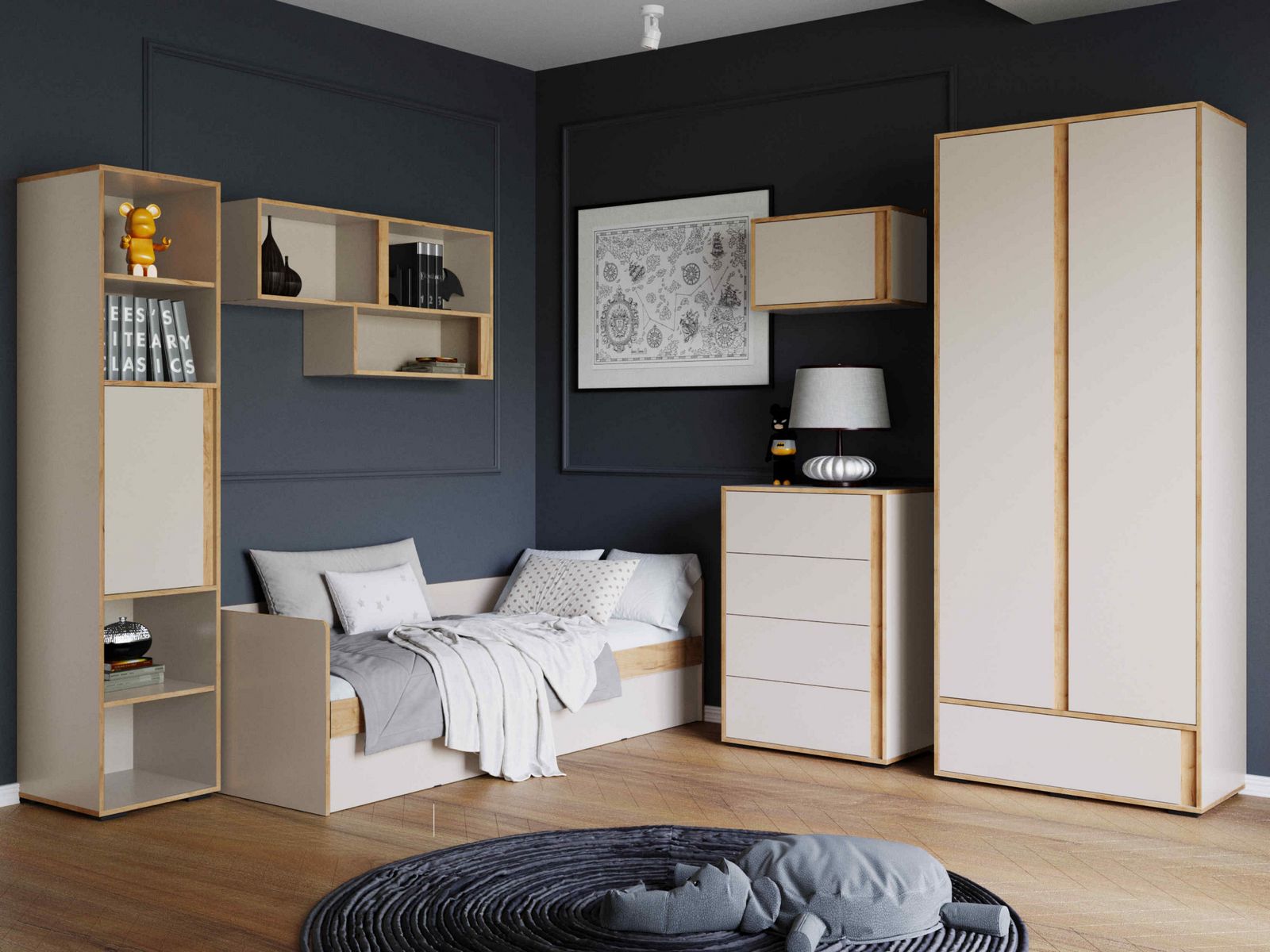 Детская Асцелла — это уютное и функциональное пространство, созданное для комфортного обучения и отдыха ребенка. Стильный шкаф с полками и широким выдвижным ящиком поможет организовать пространство. Он идеально подойдет для хранения одежды, игрушек и книг, поддерживая порядок и уют. Тумба с несколькими выдвижными ящиками предоставит дополнительное место для хранения вещей. В навесных полках можно разместить книги, сувениры, а также детские поделк