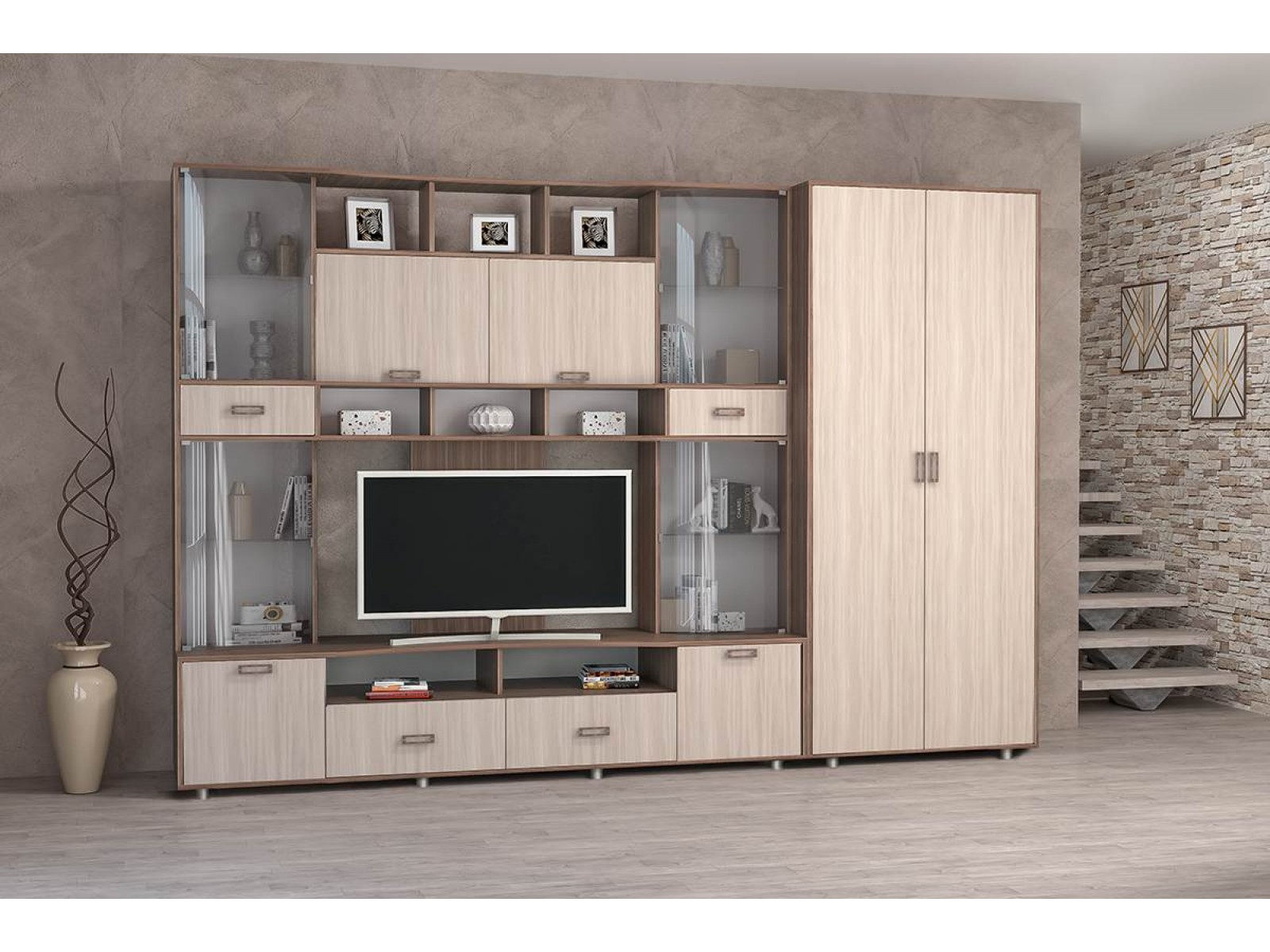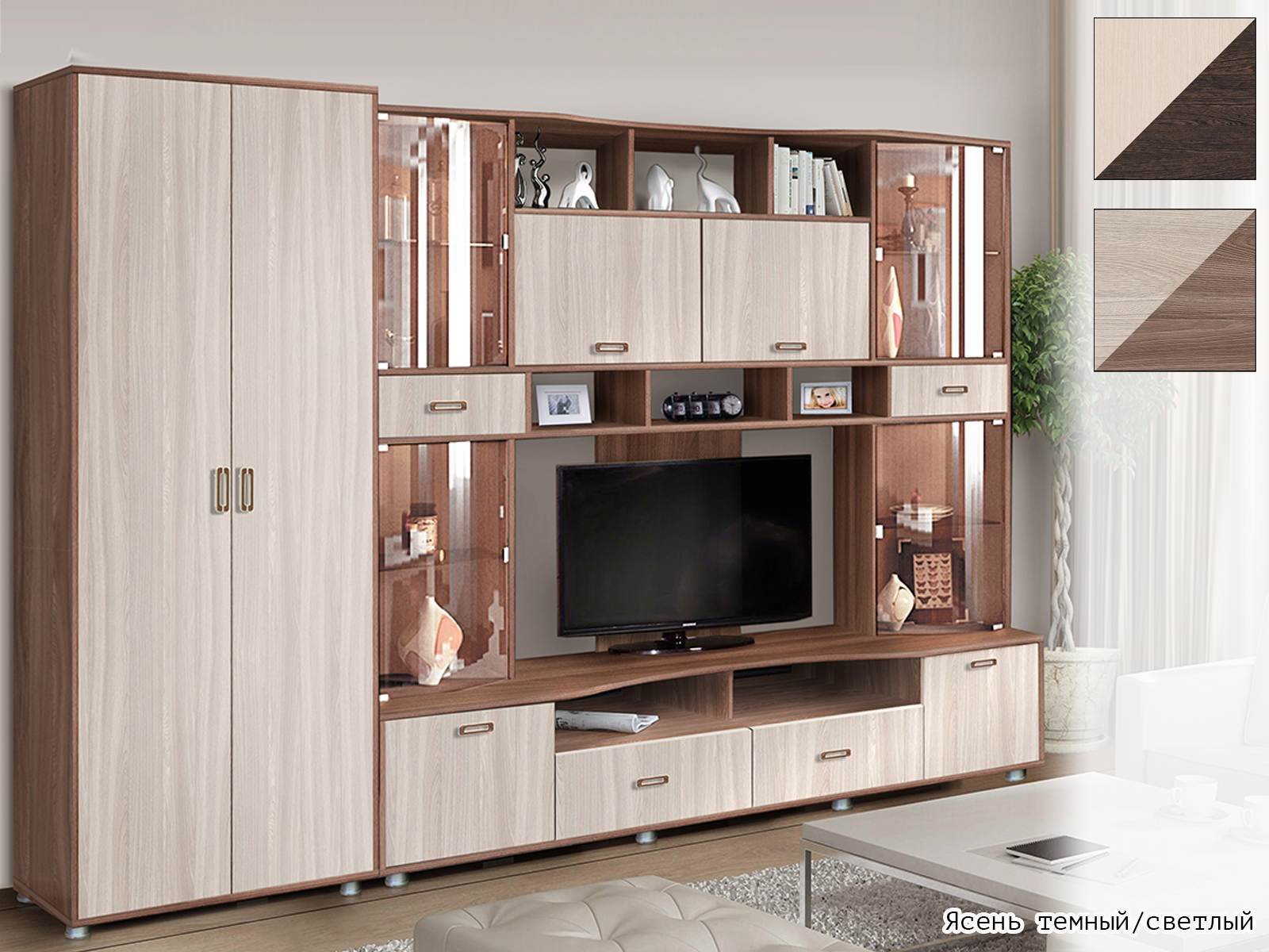 Комплект включает в себя: шкафы-витрины с гнутым стеклом, укомплектованные выдвижными ящиками; тумбу под телевизор с ящиками и нишами; открытые полки, что позволит комфортно расположить технику, красивую посуду, сувениры, книги и другие необходимые в быту вещи