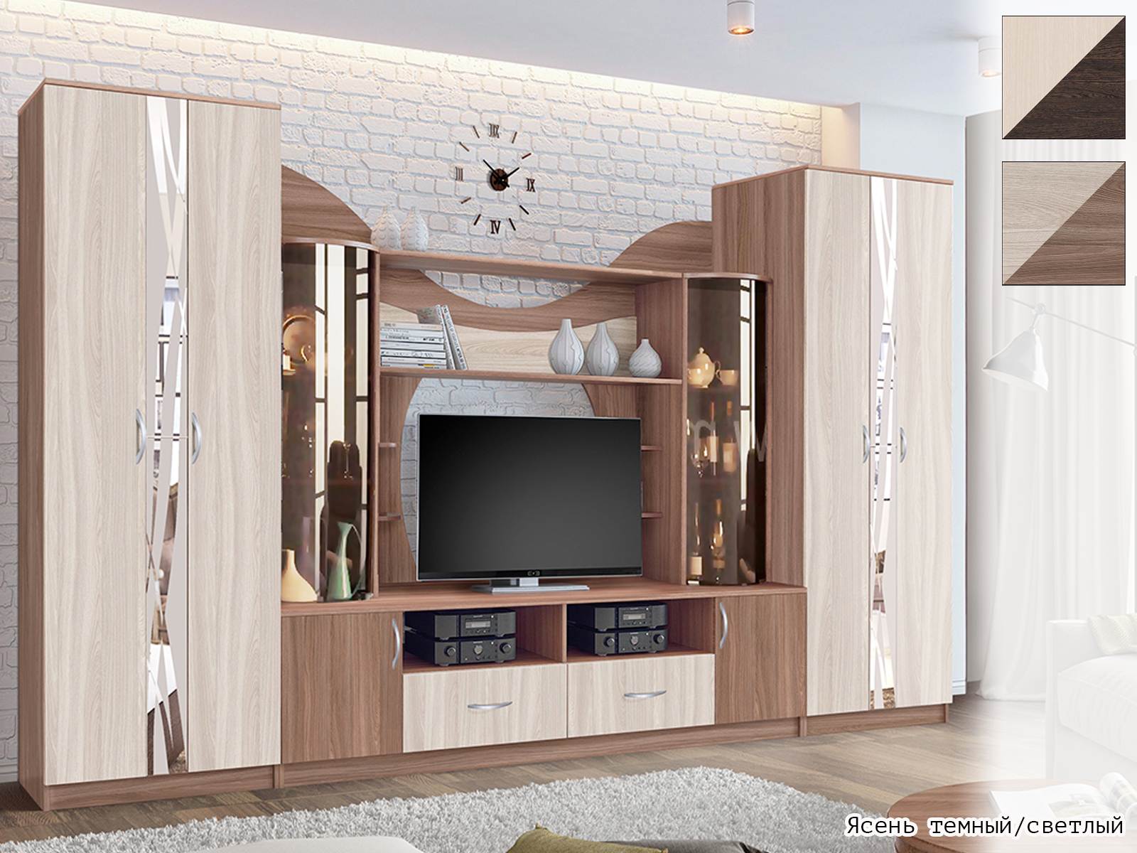 - Центральная секция (полки для книг, тумба под телевизор, шкафы - витрины с тонированным гнутым стеклом);