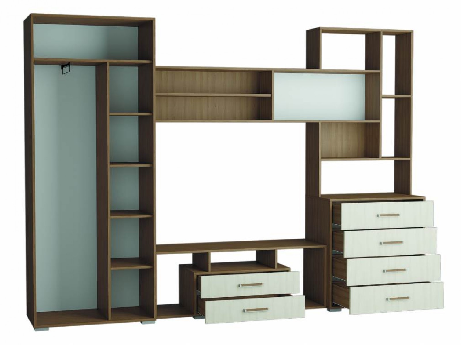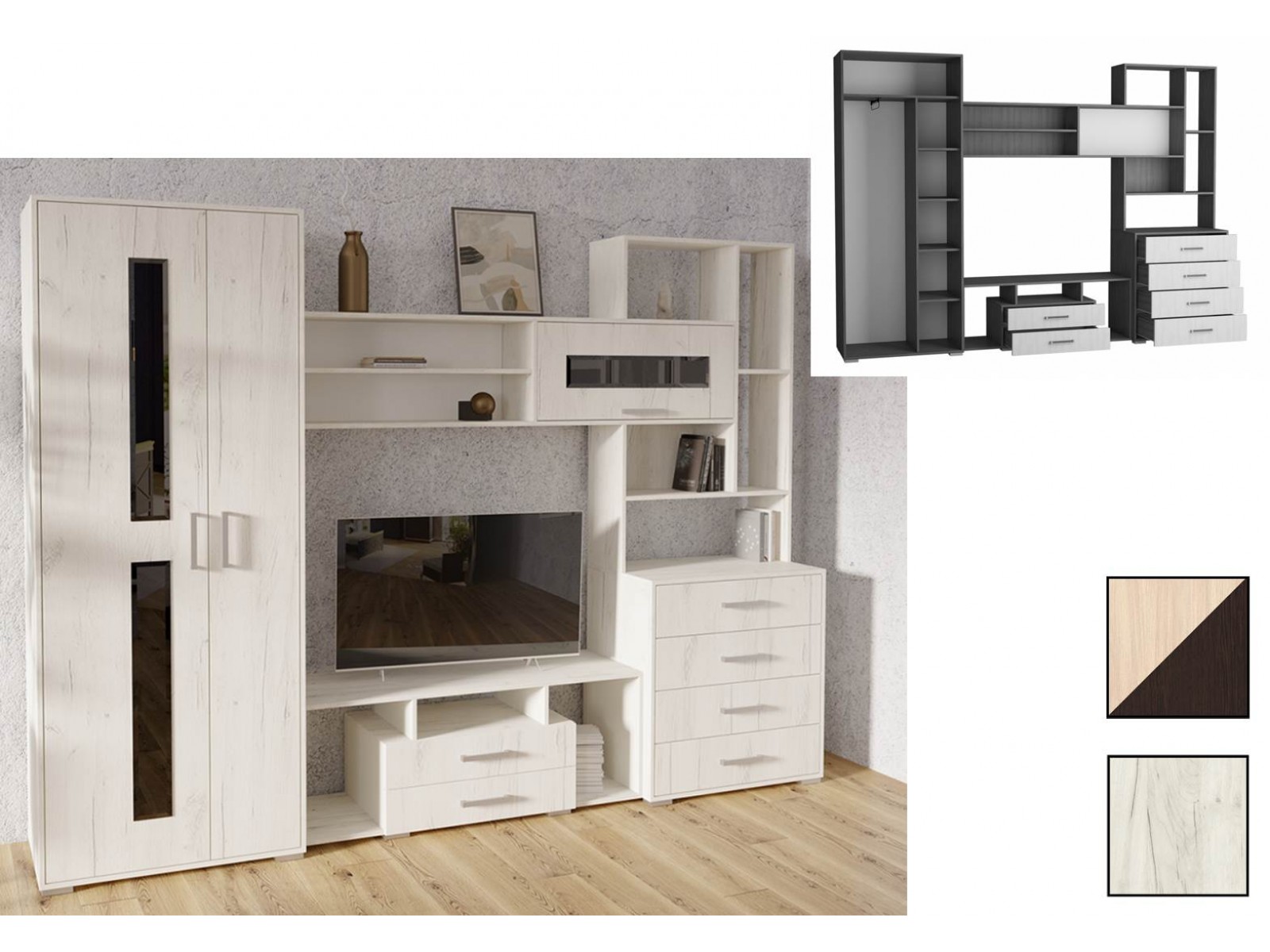 Стенка в гостиную Европа-1 – это современная модель, которая привлекает визуальной лёгкостью и разнообразием отделений. Продуманная система хранения включает в себя платяной шкаф, тумбу под ТВ, комод с выдвижными ящикам, одну глухую и множество открытых полок для книг и декоративных предметов. Фасады в нейтральных древесных тонах декорированы стильными темными накладками.