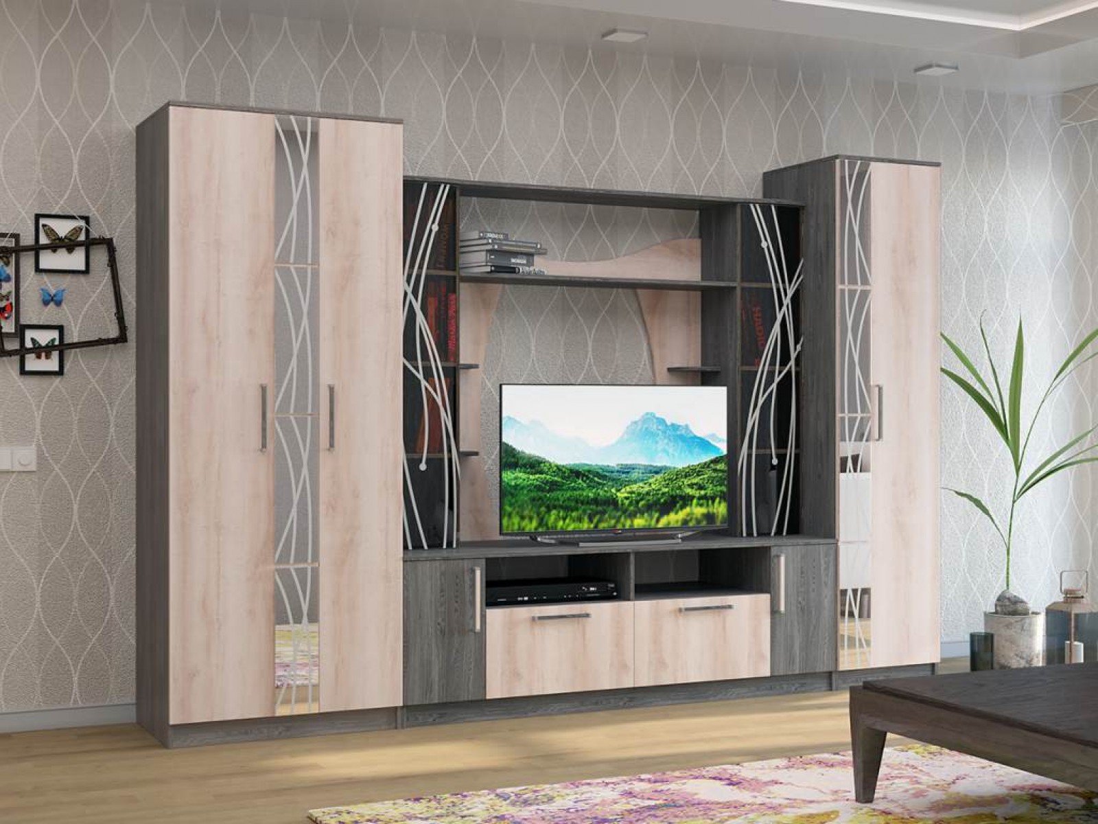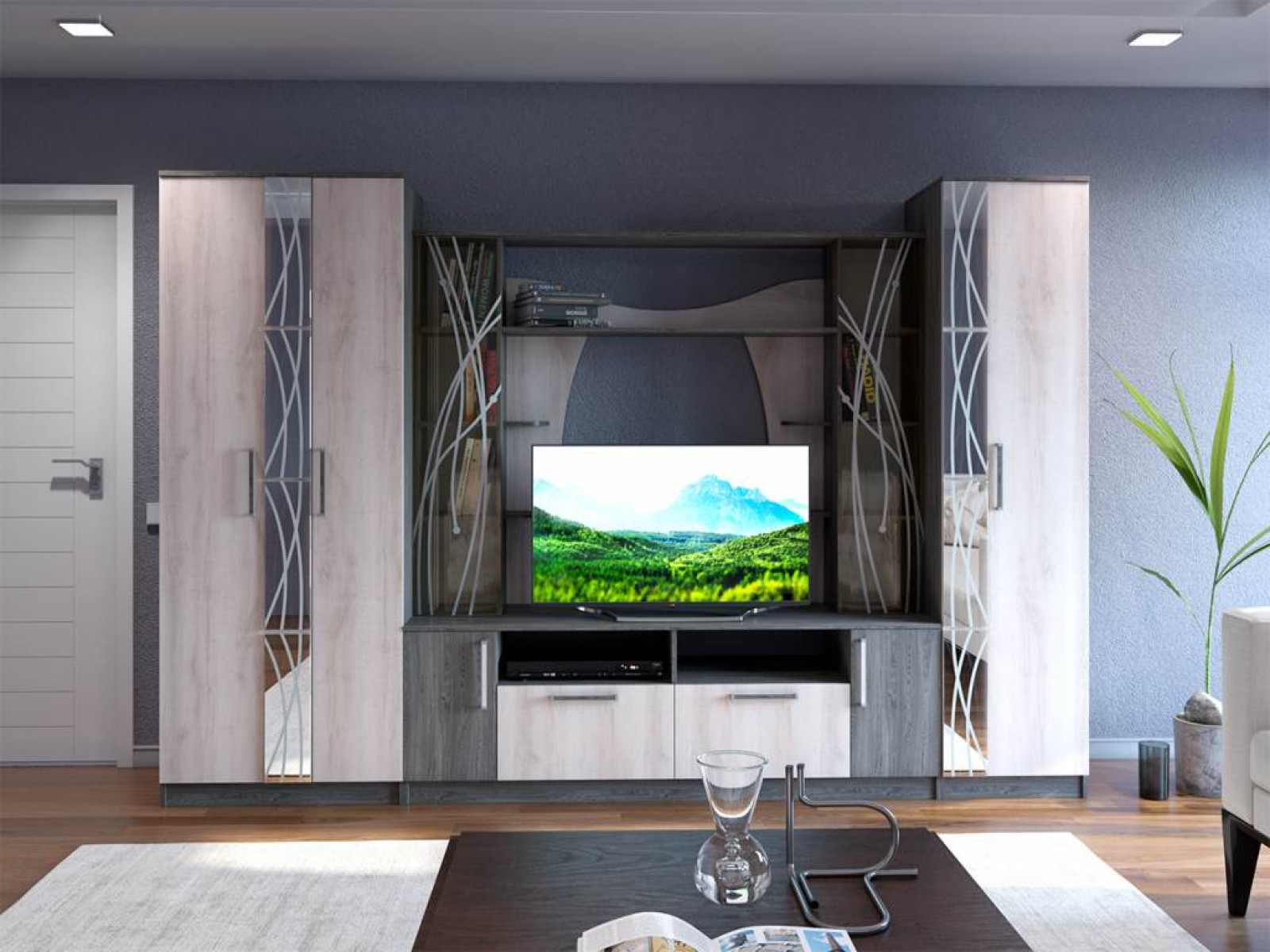 Отличительной особенностью этой стенки стало гнутое и тонированное стекло