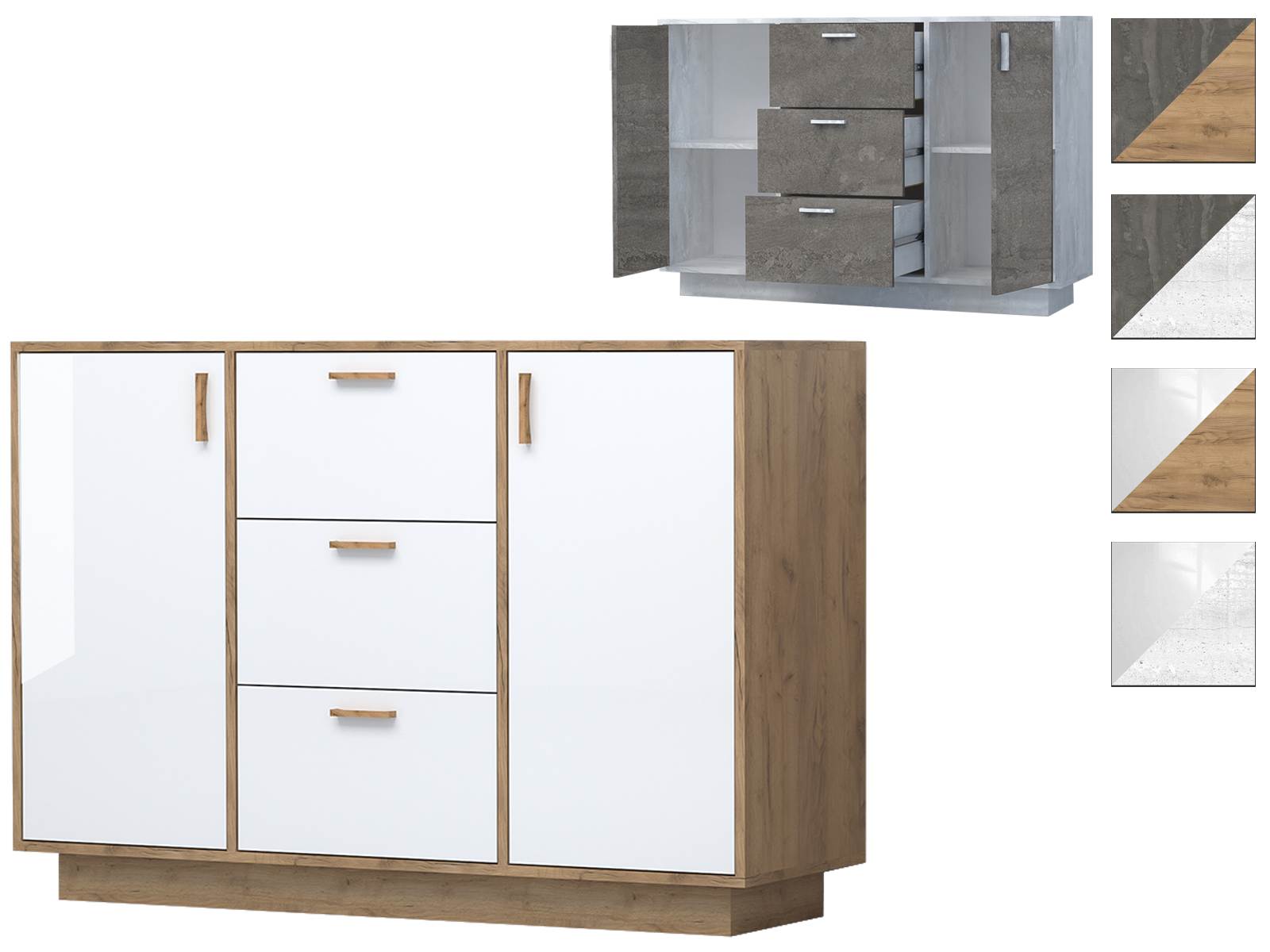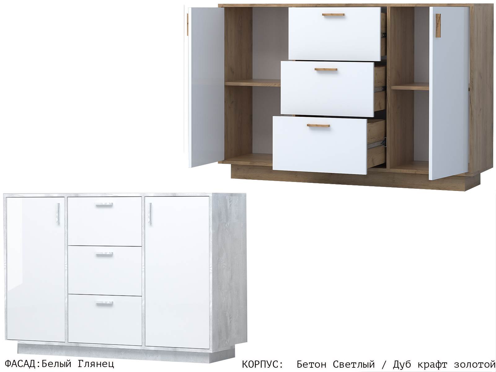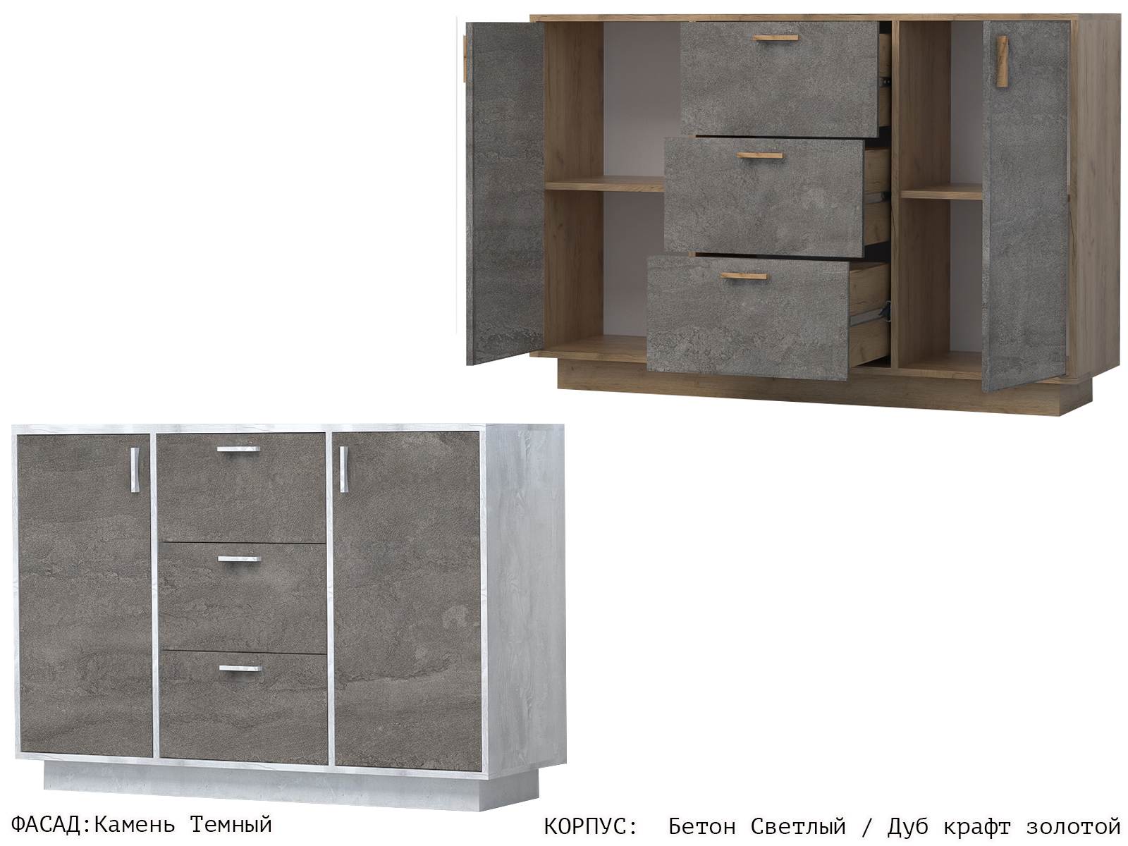 Современный комод с тремя выдвижными ящиками и двумя закрытыми нишами с полками внутри – удобная и полноценная система хранения как в спальню, так и в гостиную, рабочий кабинет, детскую. В нём можно скрыть от посторонних глаз постельные принадлежности, текстиль, нижнее бельё, косметику, документы, игрушки, а столешницу использовать как функциональную полку для приятных мелочей.
