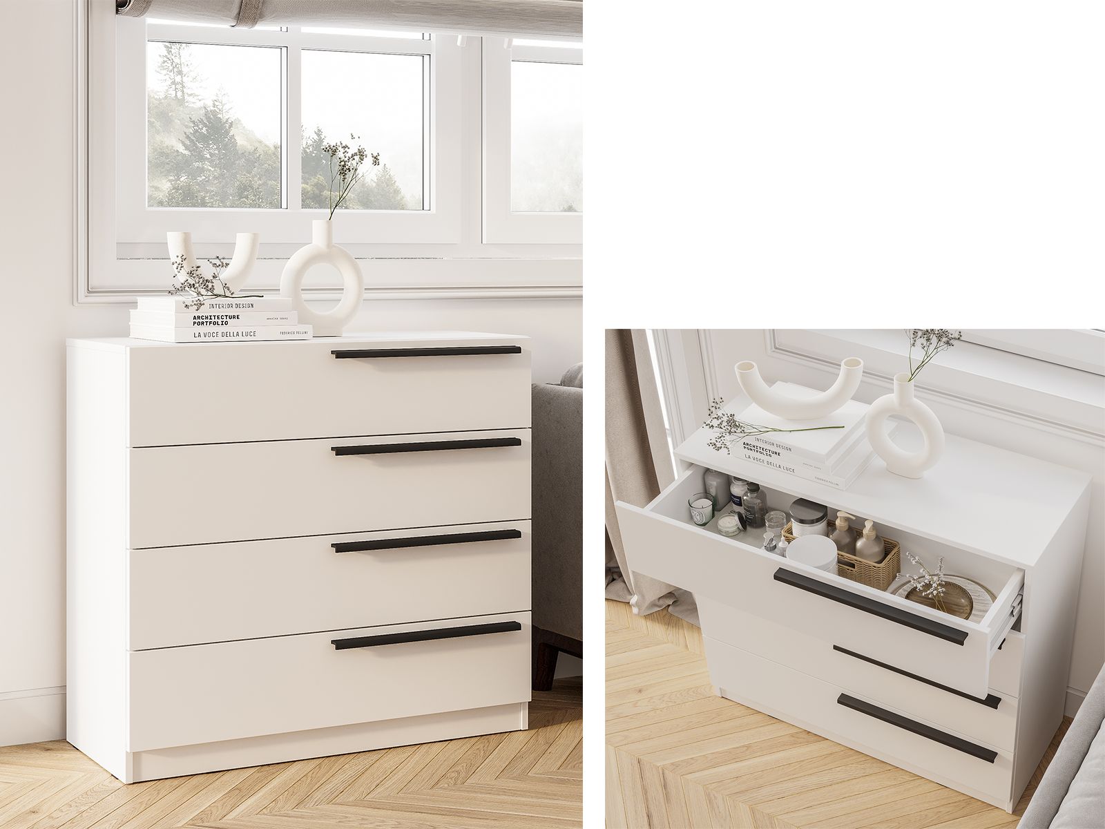 Комод Айрон - вместительный комод с четырьмя вместительными ящиками - универсальное решение, которое подойдёт и для спальни, и для домашнего кабинета, и для гостиной. Эргономичные черные ручки контрастного оттенка делают эту модель более изящной. Комод идеально подходит для хранения белья, одежды, аксессуаров, важных документов, украшений и мелочей. Верхнюю крышку можно использовать как дополнительную полочку для лампы.