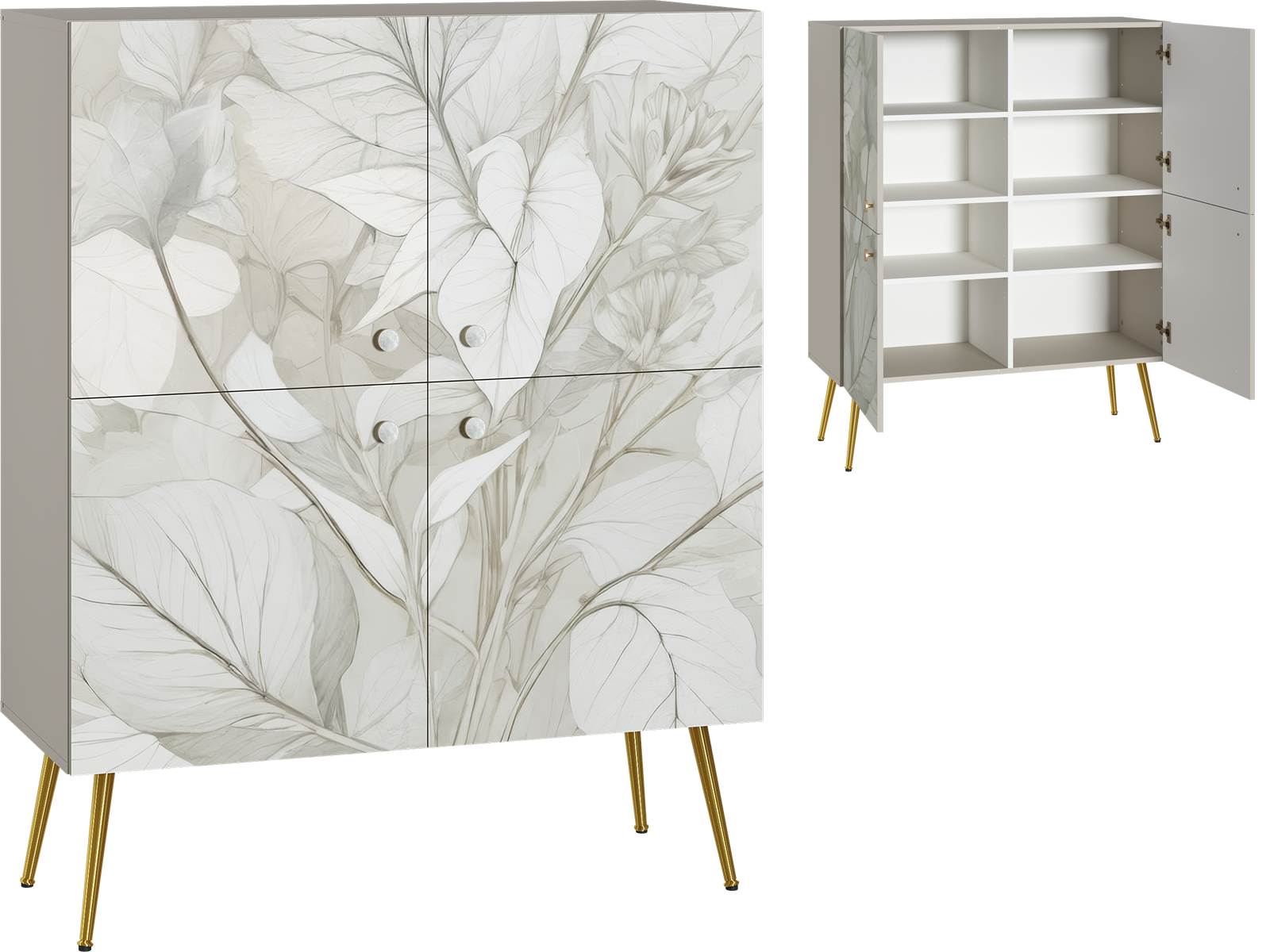 Комод имеет четыре глухие распашные двери, за которыми восемь полок.