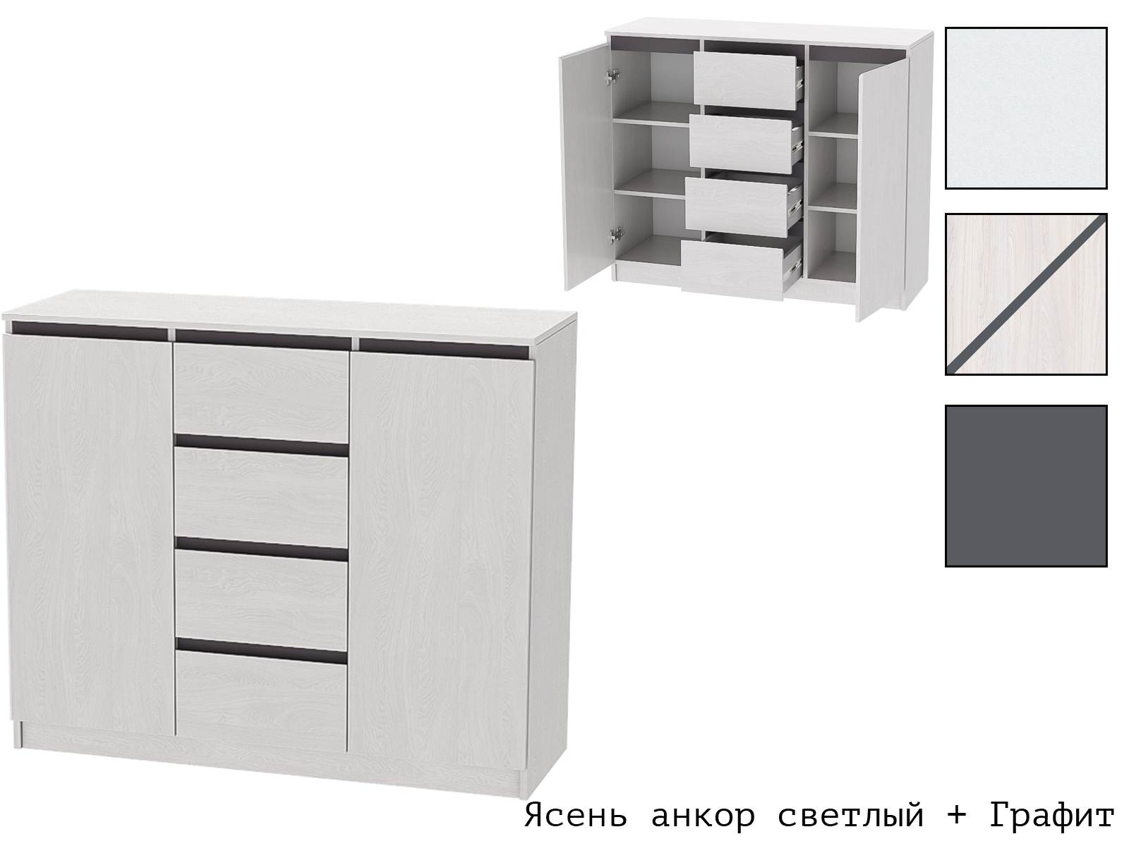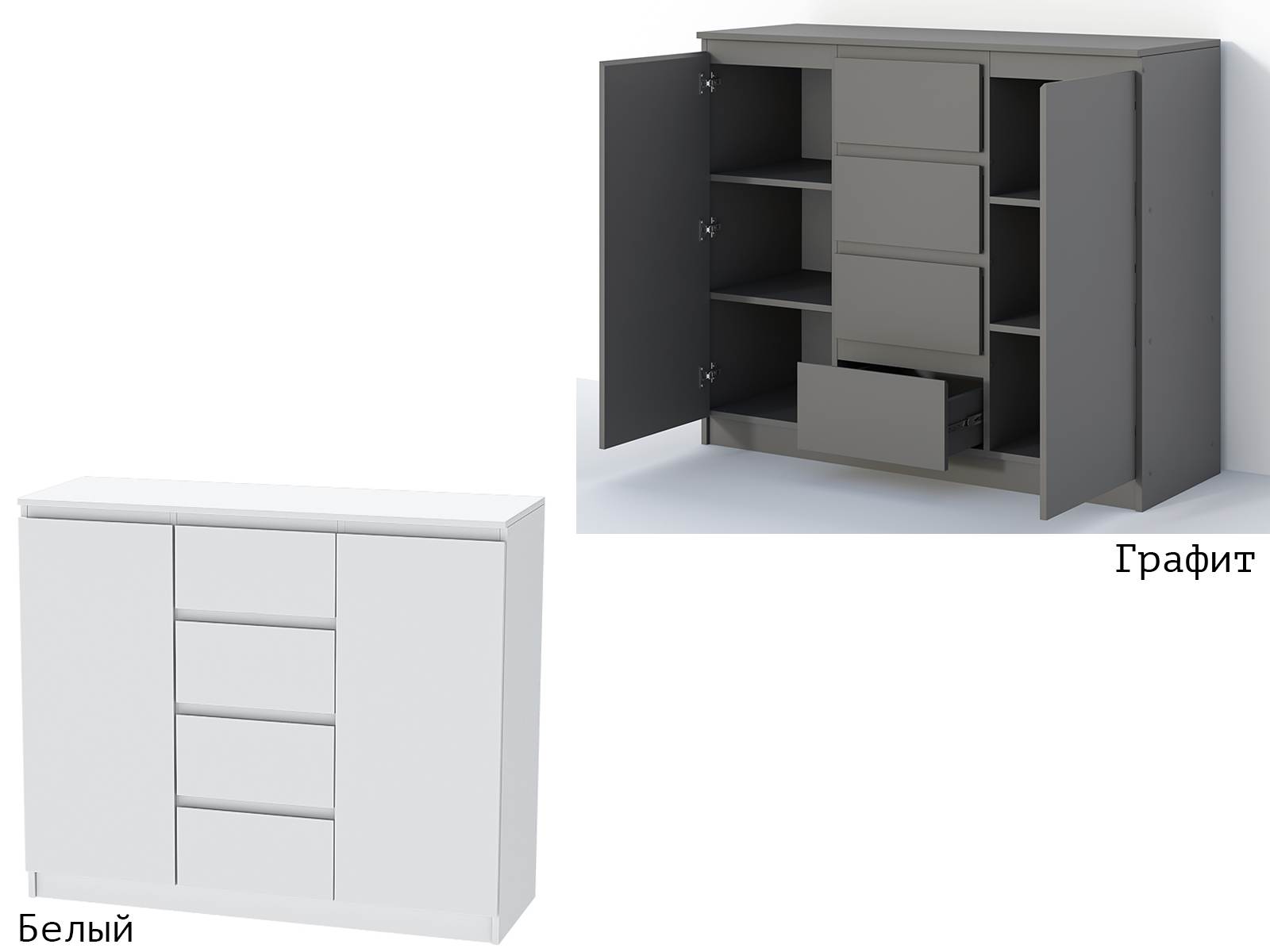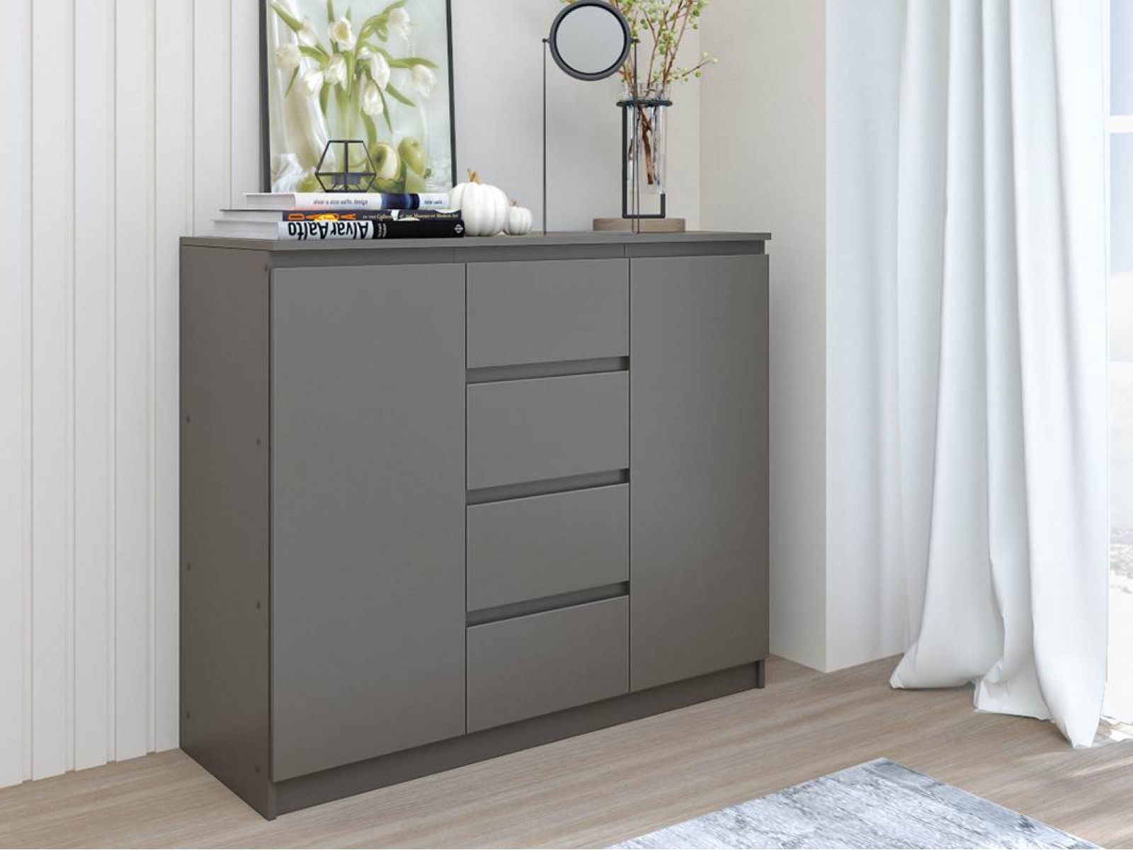 Комод с четырьмя выдвижными ящиками и двумя закрытыми нишами с полками внутри - удобная и полноценная система хранения, идеально подходящая для любого помещения: спальни, гостиной, рабочего кабинета, детской. В нём можно хранить текстиль, постельные принадлежности, бельё и другие вещи, а столешницу использовать как функциональную полку для приятных мелочей.
