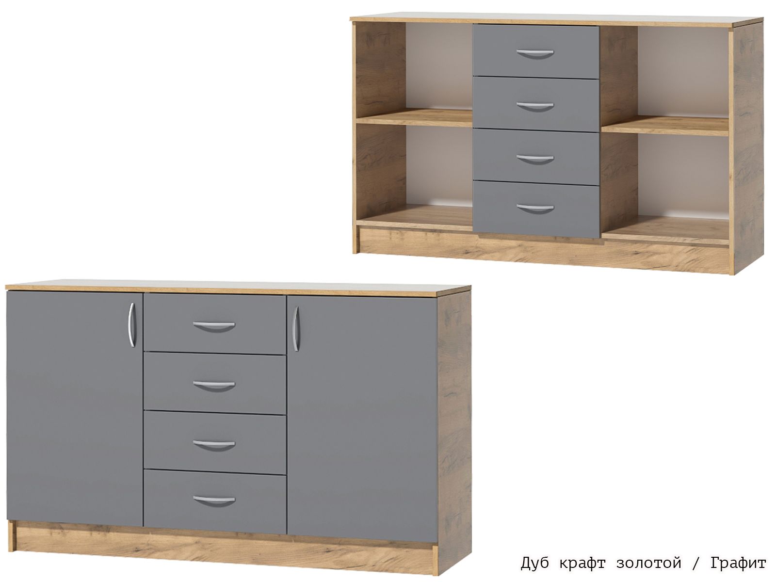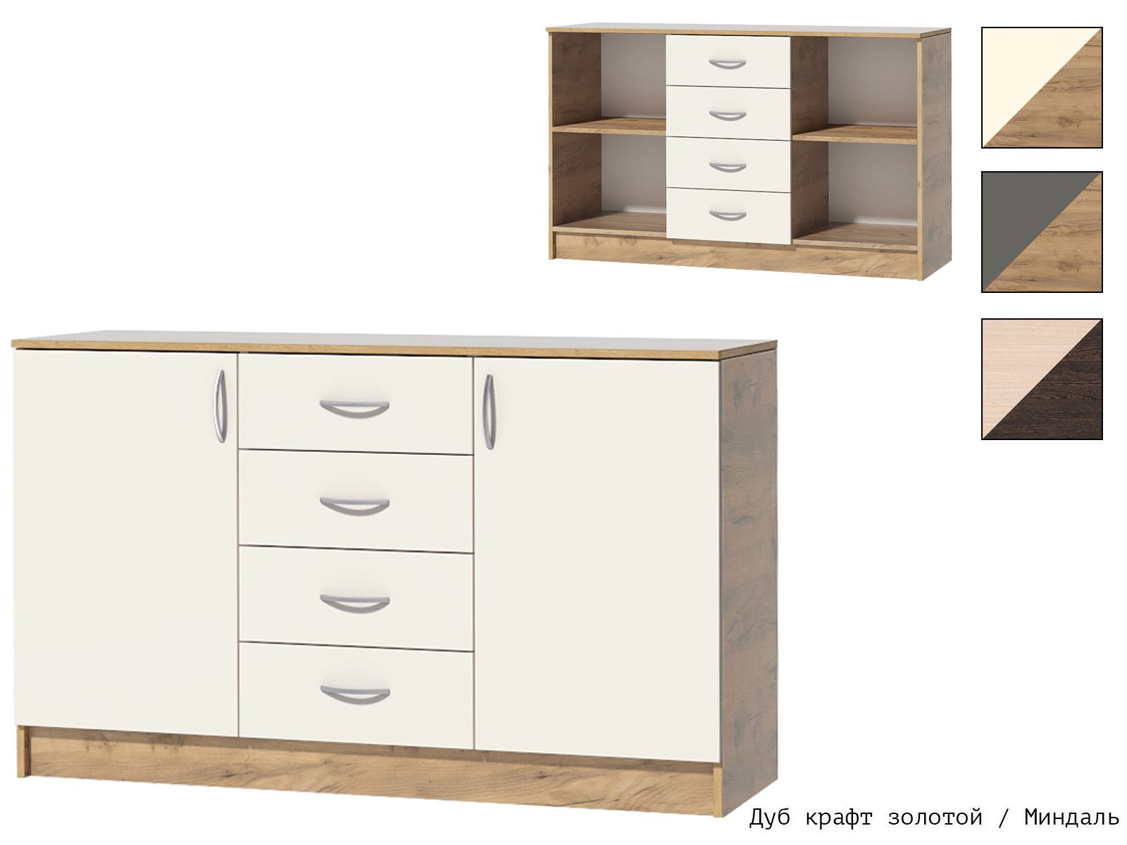 Комод с четырьмя выдвижными ящиками и двумя закрытыми нишами с полками внутри - удобная и полноценная система хранения, идеально подходящая для любого помещения: спальни, гостиной, рабочего кабинета, детской. В нём можно хранить текстиль, документы, детские игрушки, а столешницу использовать как функциональную полку для приятных мелочей: статуэток, красивых ваз, светильника, семейных фотографий.