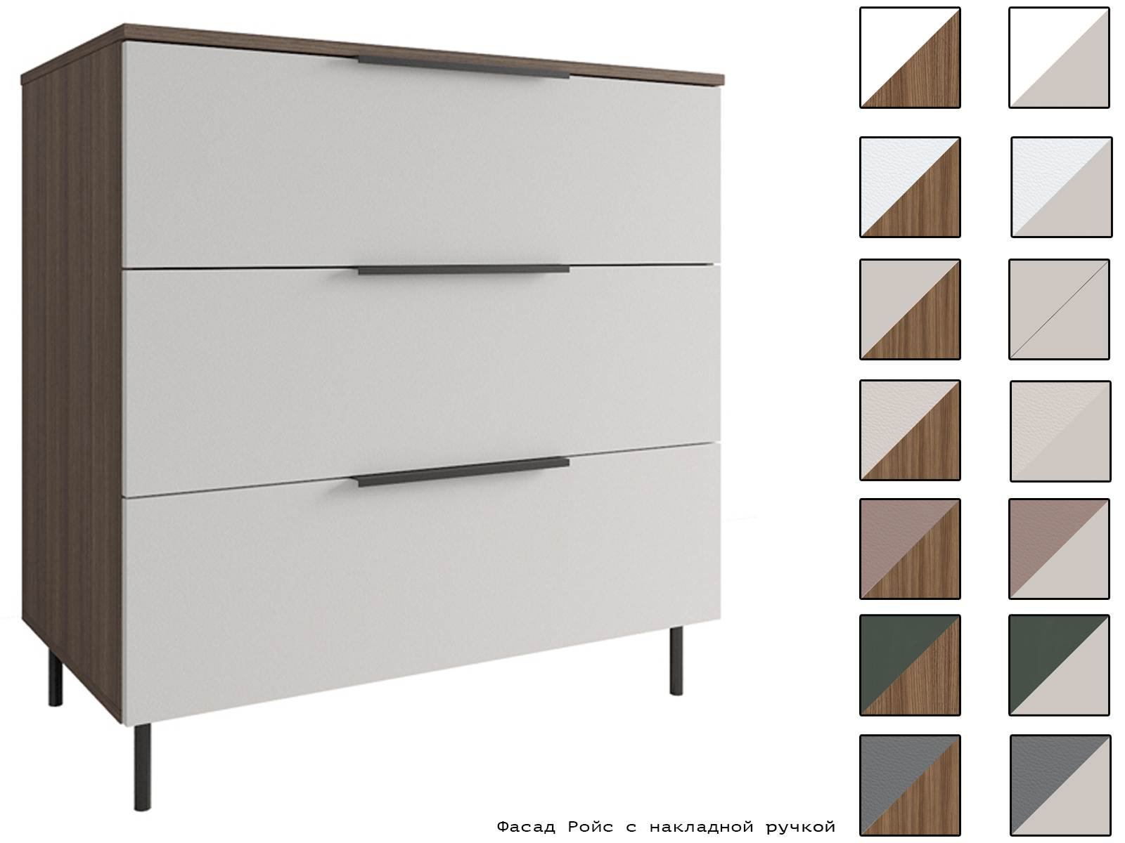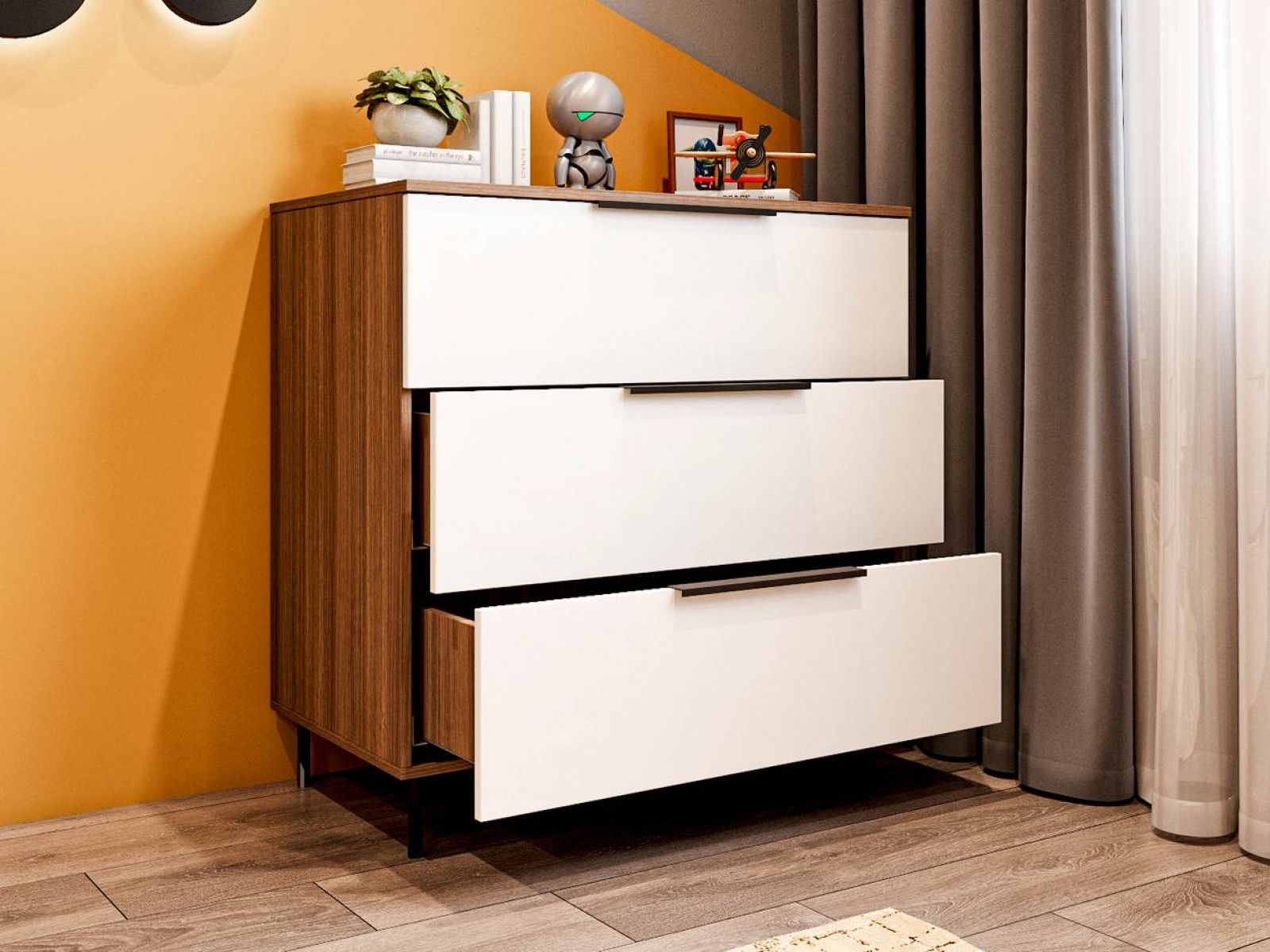 Комод оснащен тремя выдвижными ящиками, что обеспечивает достаточно места для хранения различных предметов. Для удобства использования и долговечности, фурнитура скрытого монтажа с доводчиками обеспечивает плавное и бесшумное закрывание ящиков. Кроме того, наличие металлических ножек высотой 120 мм. обеспечивает достаточно высокое расположение комода над полом, что позволяет легко убираться под ним.