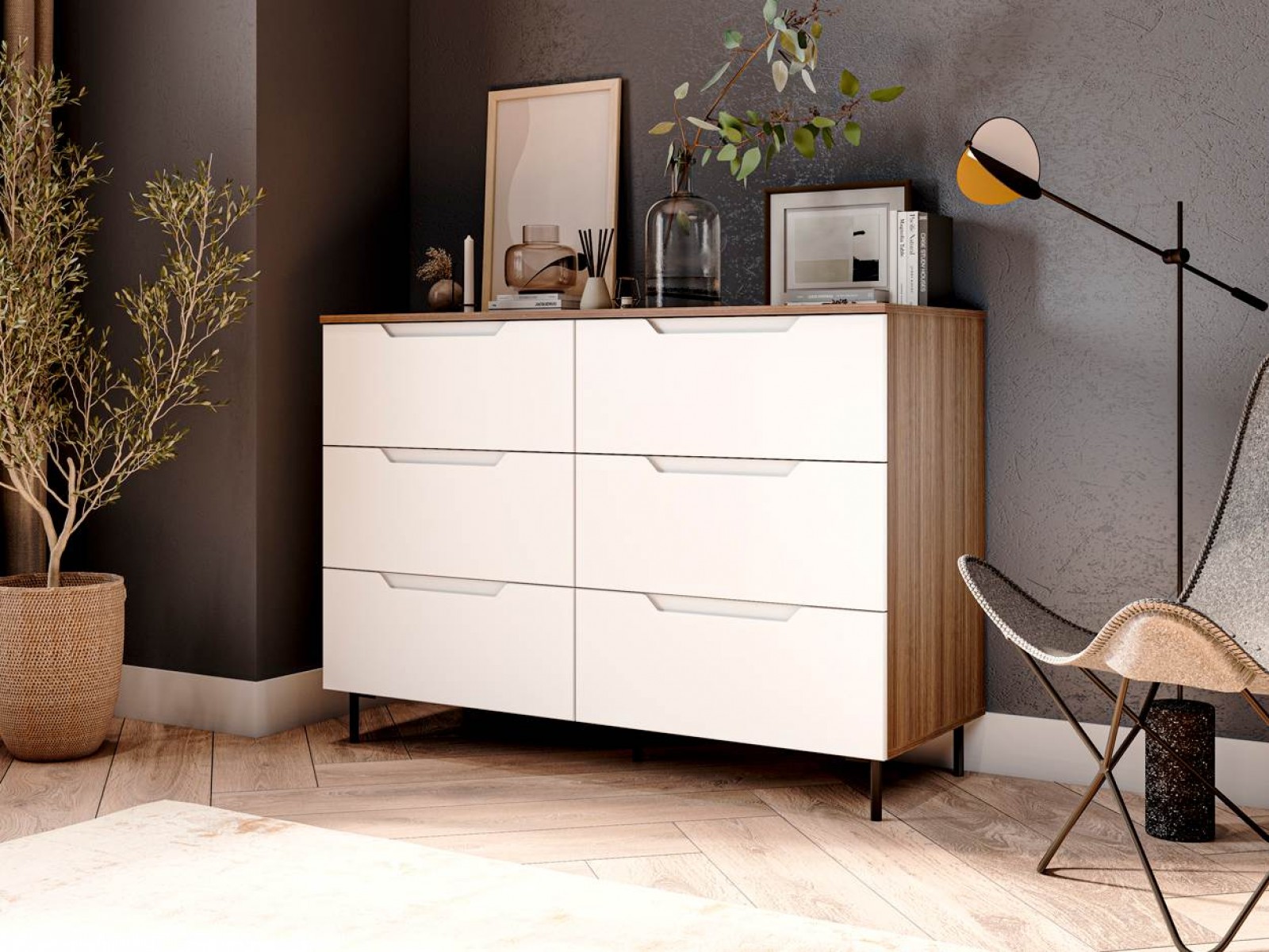 Комод имеет шесть выдвижных ящиков, которые обеспечивают достаточно места для хранения различных вещей.