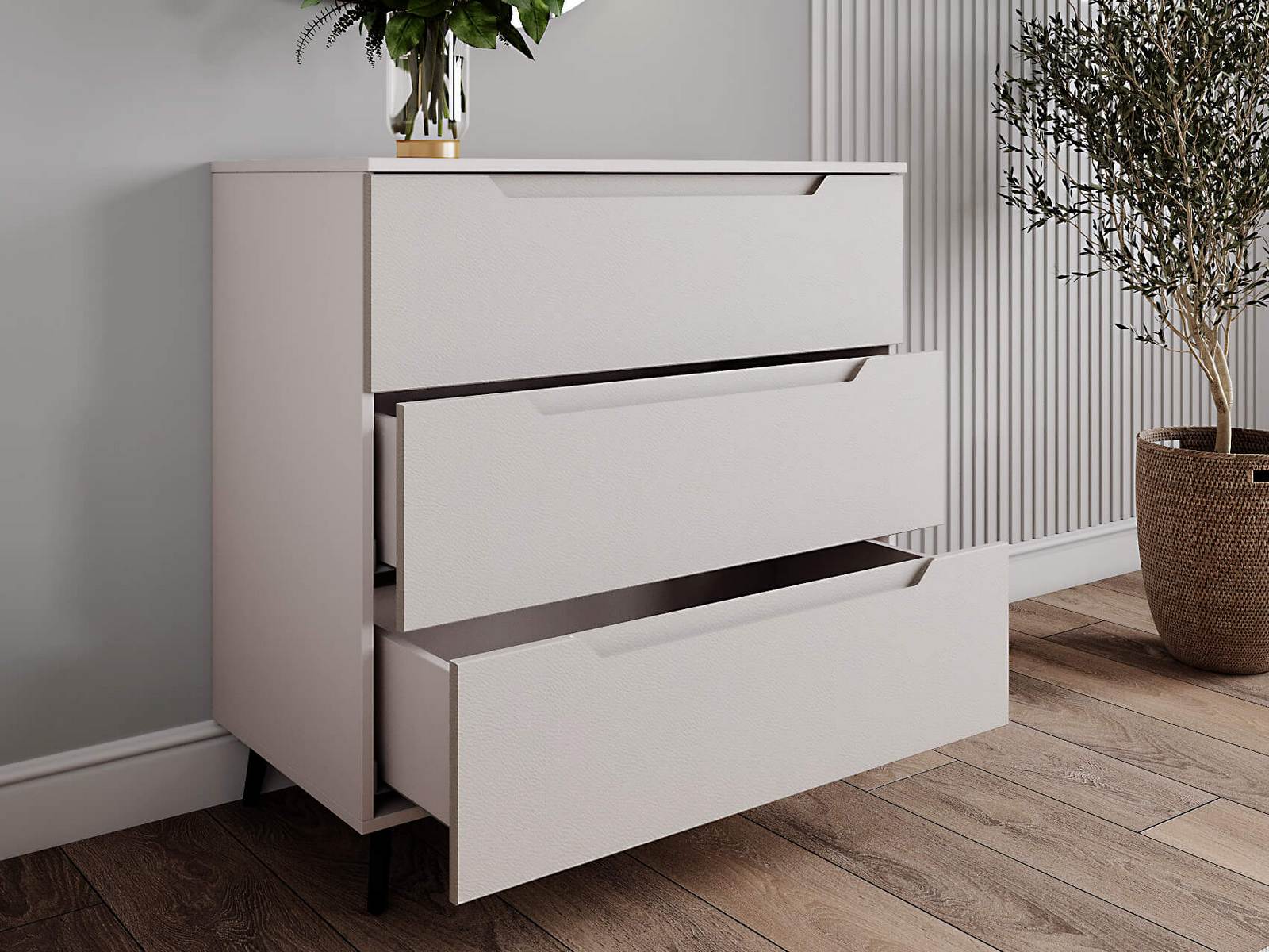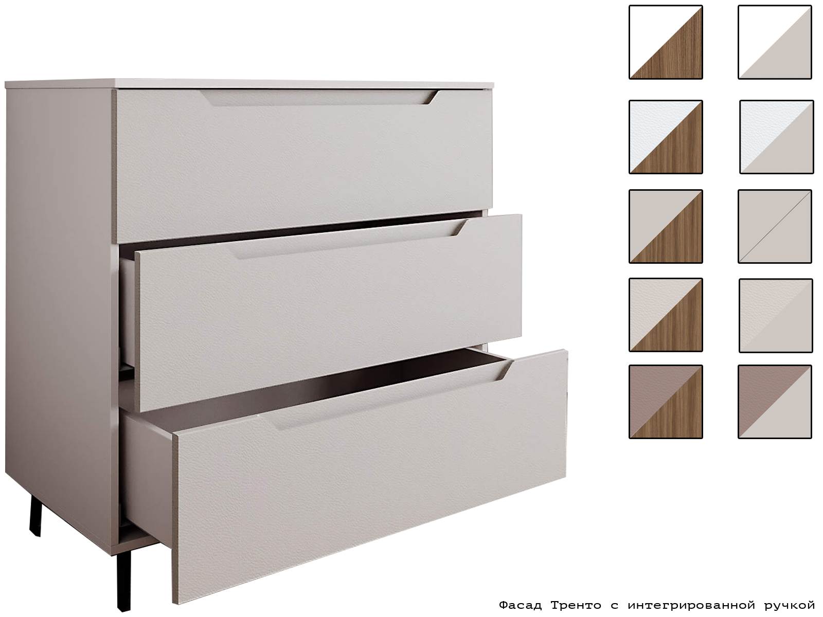 Комод оснащен тремя выдвижными ящиками, что обеспечивает достаточно места для хранения различных предметов. Для удобства использования и долговечности, фурнитура скрытого монтажа с доводчиками обеспечивает плавное и бесшумное закрывание ящиков. Кроме того, наличие металлических ножек высотой 120 мм. обеспечивает достаточно высокое расположение комода над полом, что позволяет легко убираться под ним.