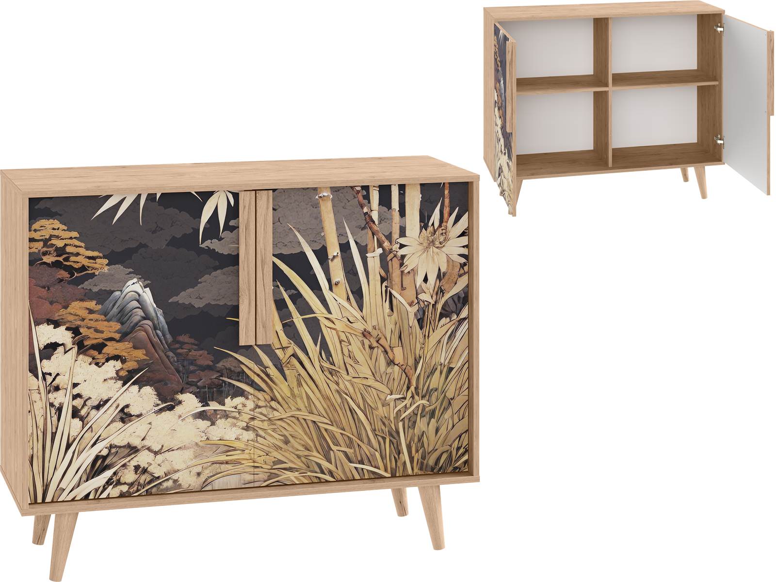 Комод имеет две глухие распашные двери, за которыми по две полки.