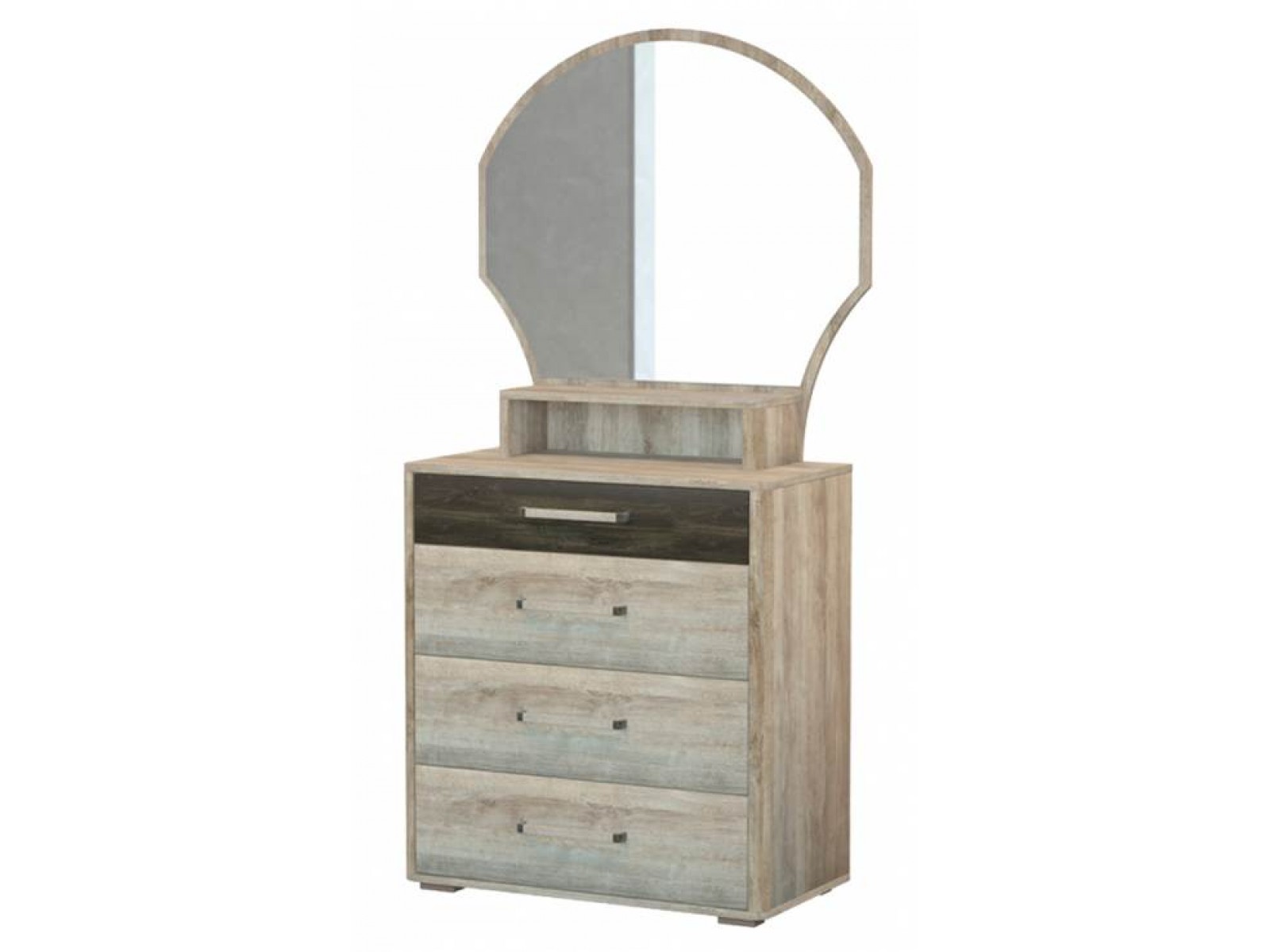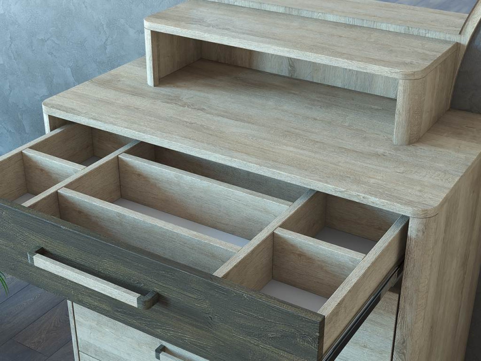 Конструкция с выдвижными ящиками для хранения и открытой полкой и зеркалом.