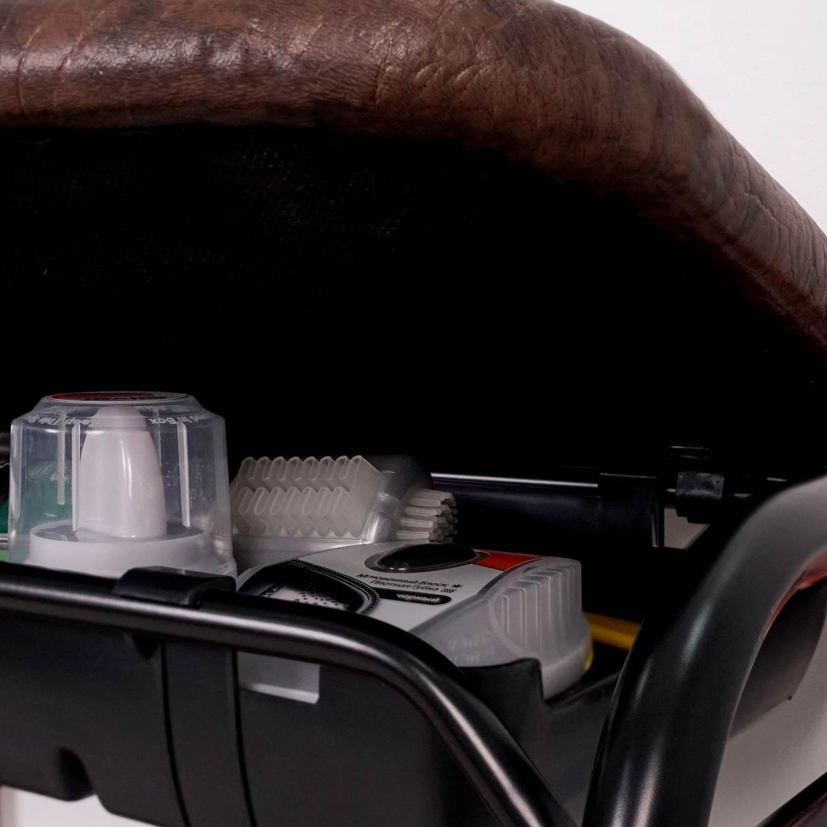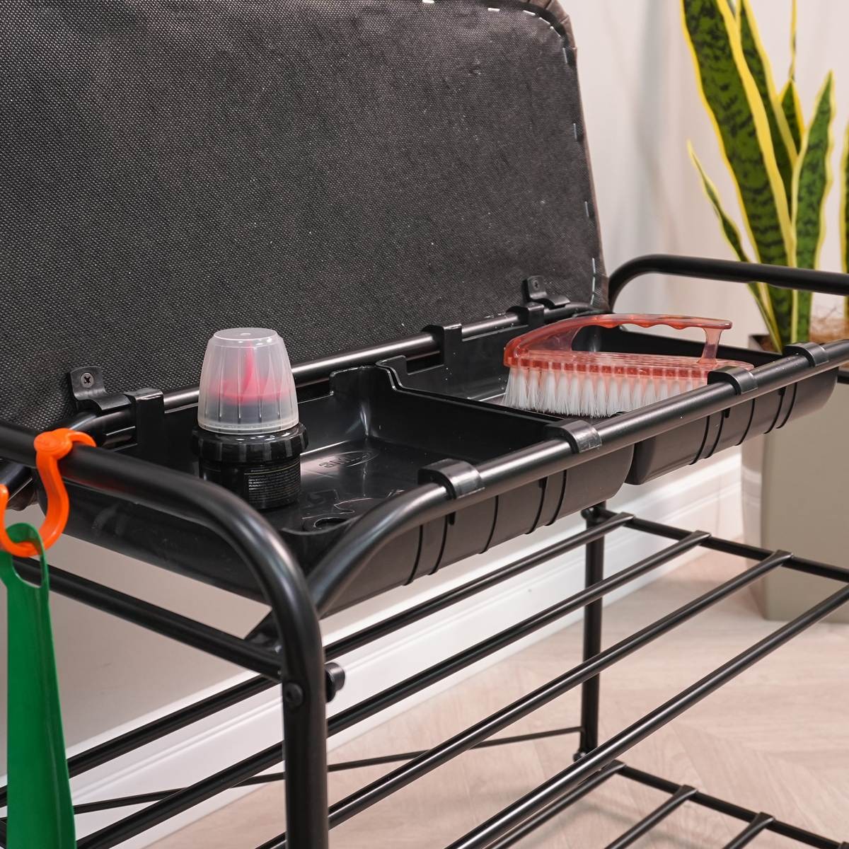 Открытая конструкция с полками для хранения и сиденьем для удобства эксплуатации и ящиком для сопутствующих предметов.