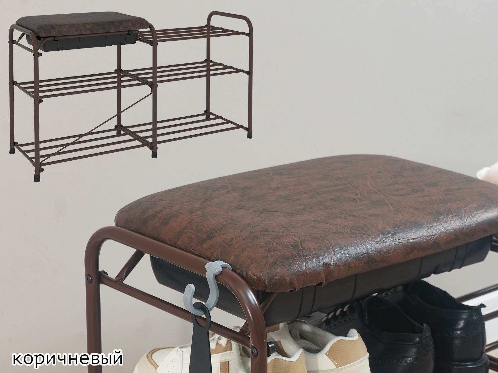 Открытая конструкция с тремя полками для хранения, сиденьем и ящиком для хранения.