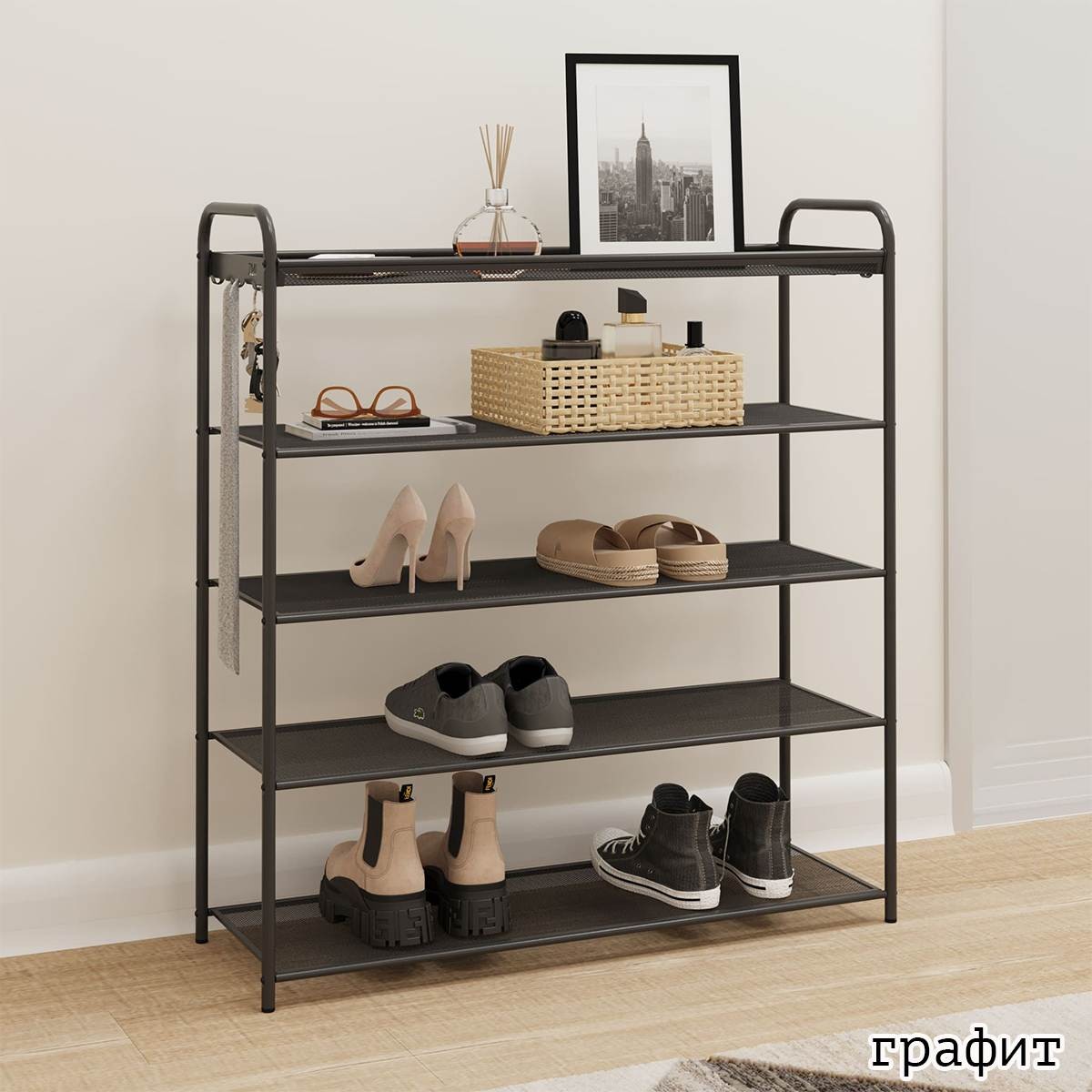 Открытая конструкция с пятью полками для хранения.