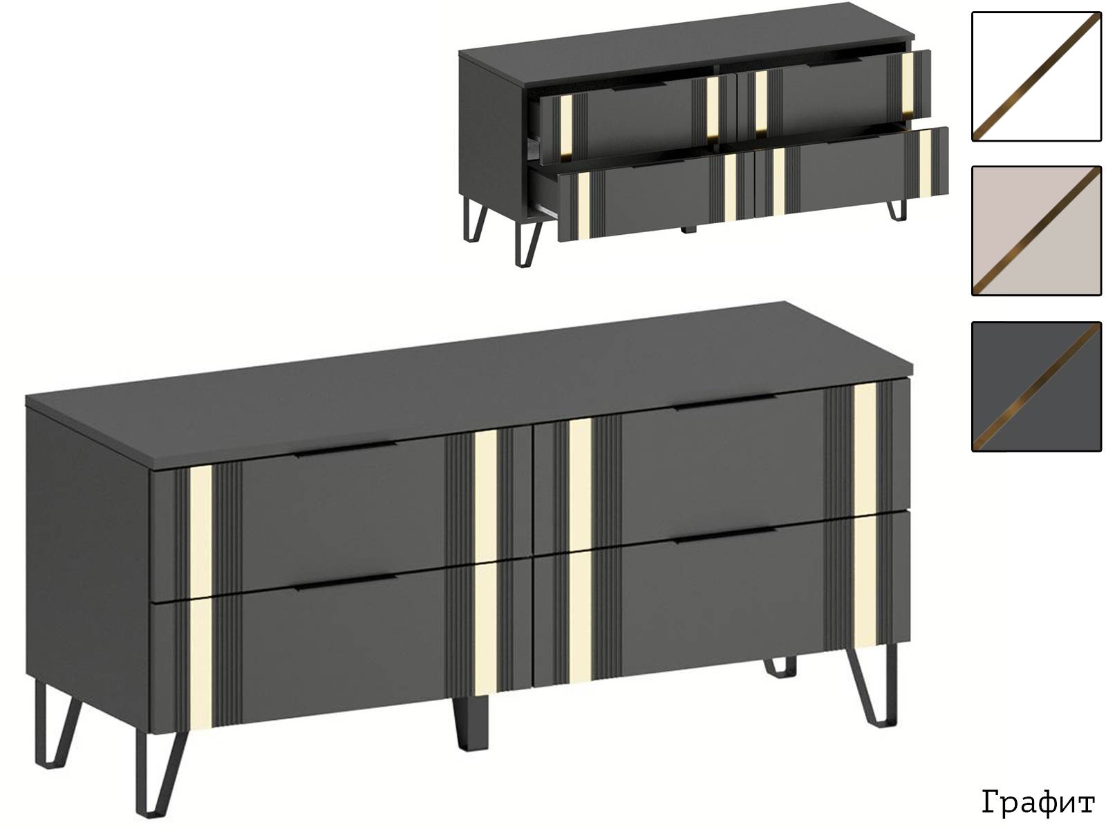 Фасады с оригинальной фрезеровкой изготовлены из МДФ и декорированы металлической полосой в цвете золото браш.