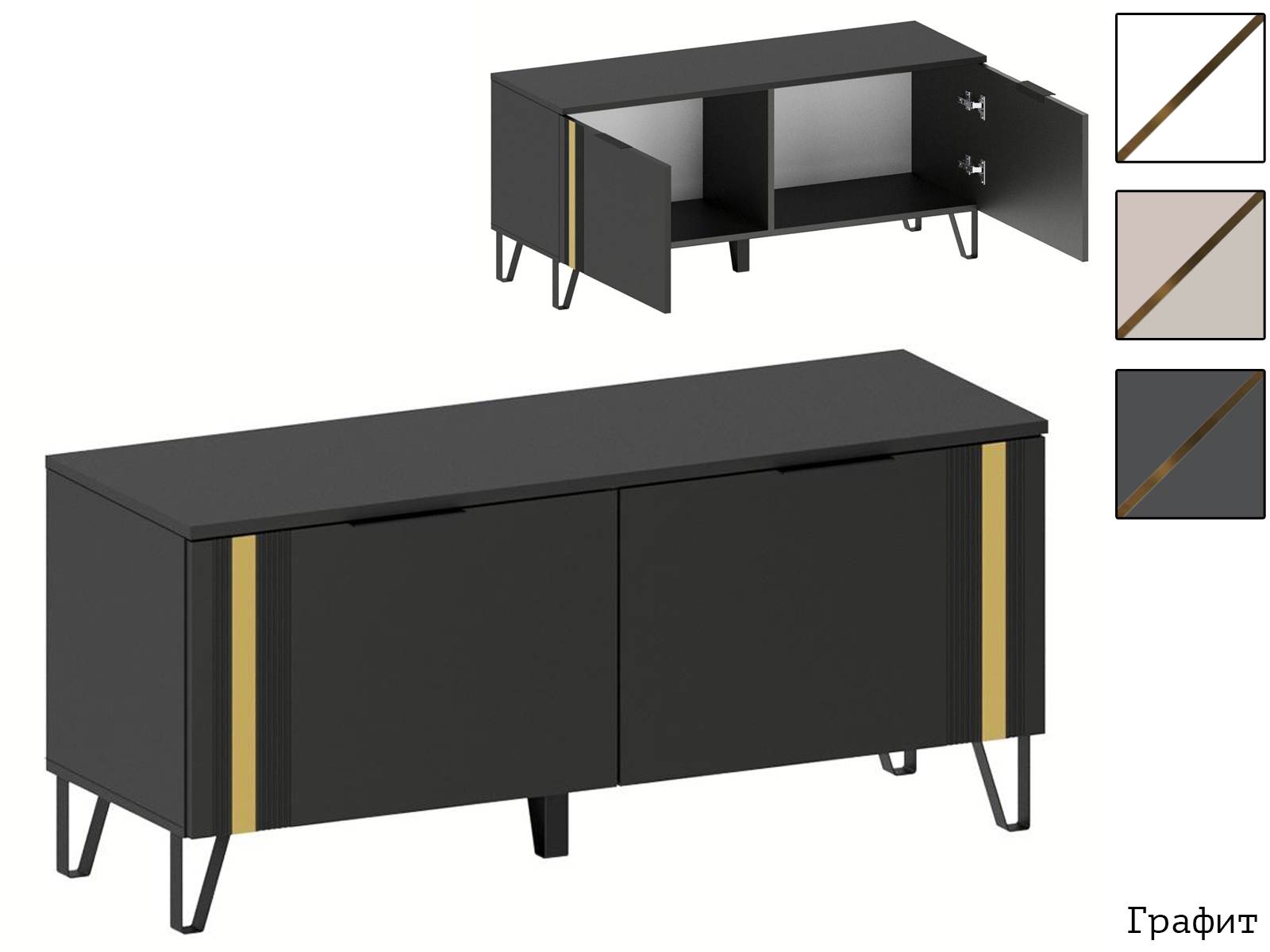Фасады с оригинальной фрезеровкой изготовлены из МДФ и декорированы металлической полосой в цвете золото браш.