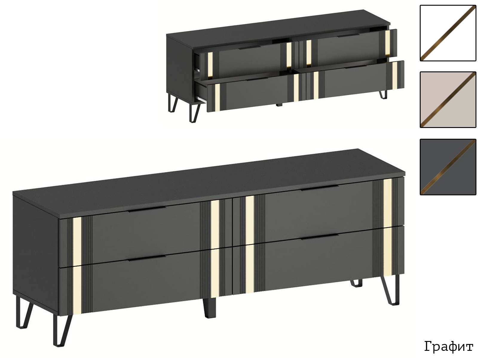Фасады с оригинальной фрезеровкой изготовлены из МДФ и декорированы металлической полосой в цвете золото браш.