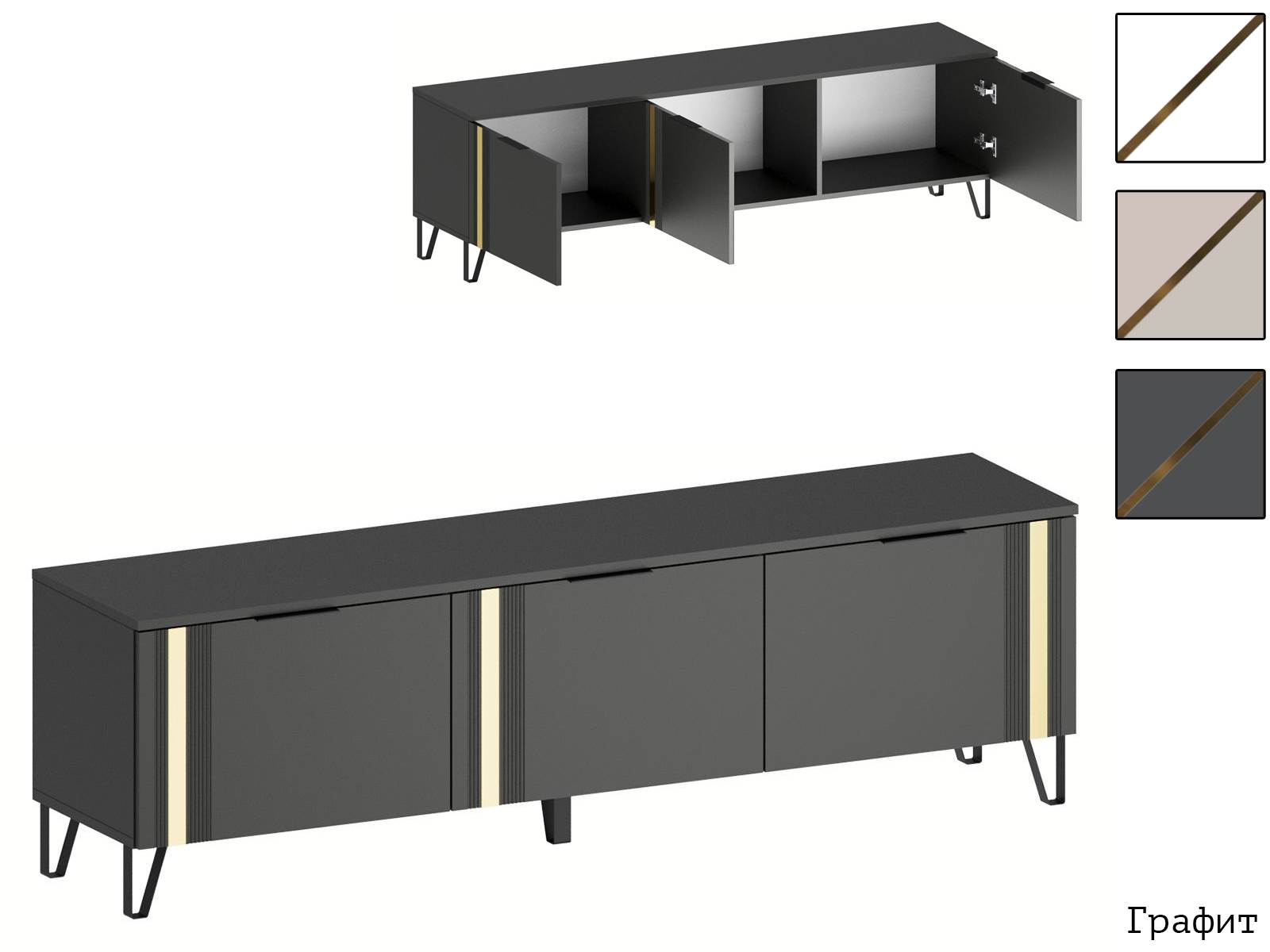 Фасады с оригинальной фрезеровкой изготовлены из МДФ и декорированы металлической полосой в цвете золото браш.