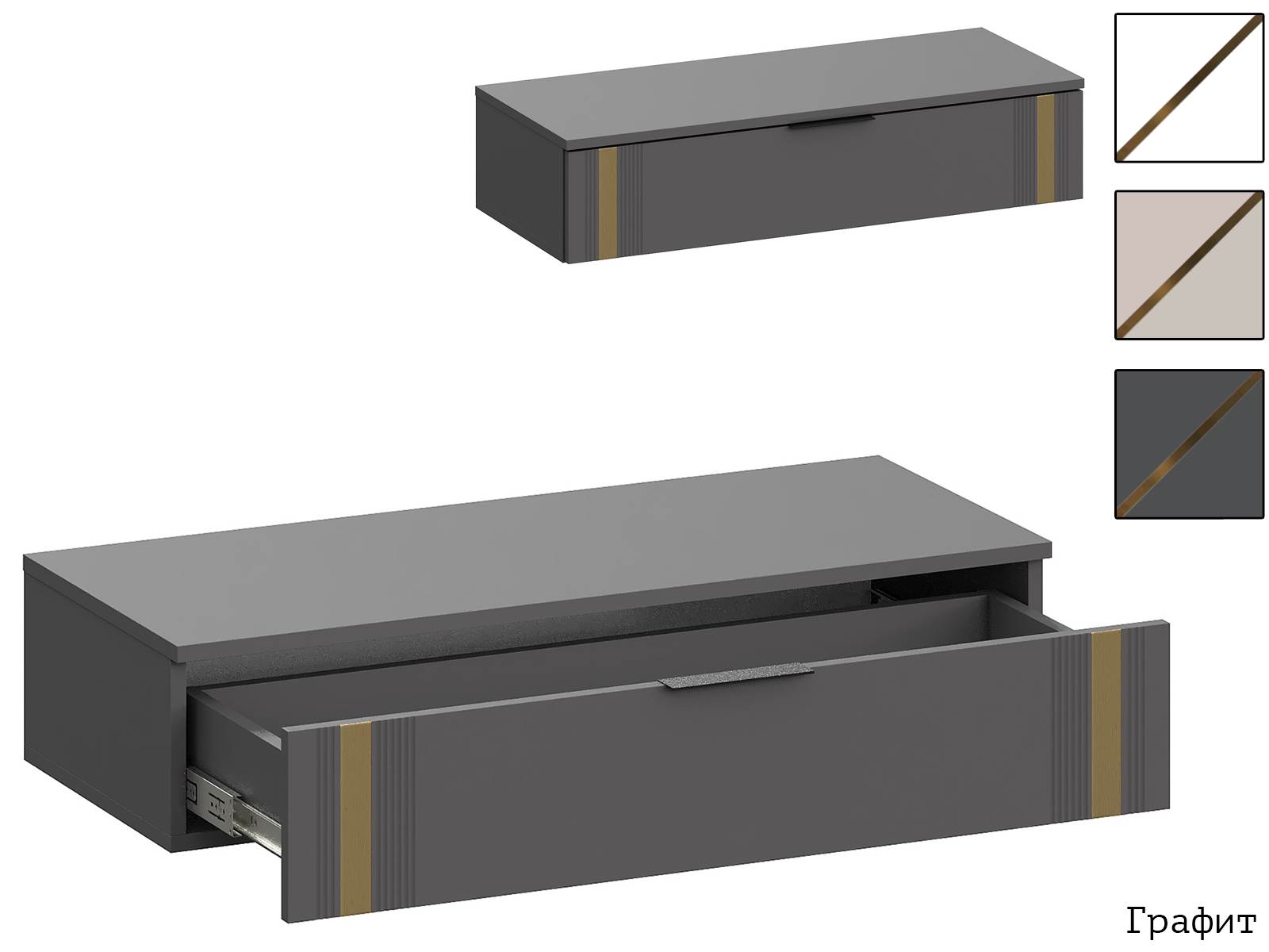 Фасады с оригинальной фрезеровкой изготовлены из МДФ и декорированы металлической полосой в цвете золото браш.