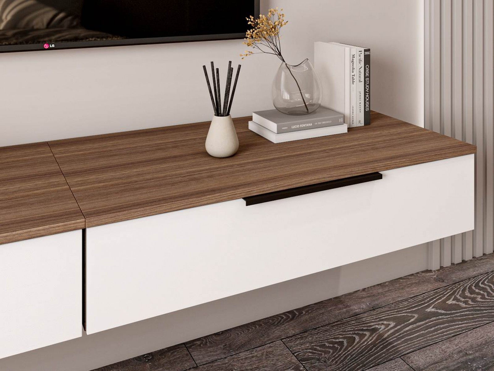 Благодаря своей подвесной конструкции, тумба не занимает много места в комнате, что делает ее идеальным решением для небольших помещений. Фасады тумбы изготовлены из МДФ, что позволяет легко ухаживать за поверхностью и обеспечивает долговечность изделия. Направляющие: Скрытого монтажа с доводчиками для ящиков