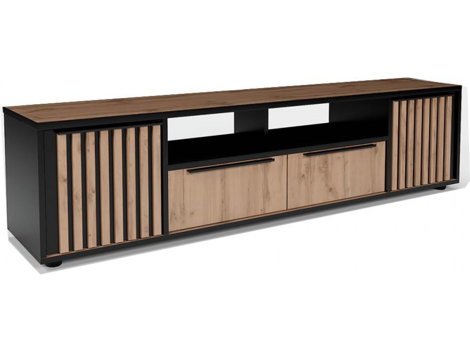 Тумба под ТВ НКМ Аэлита секция №15 в элегантном сочетании чёрного и дуба вотан представляет собой стильный и функциональный элемент интерьера.