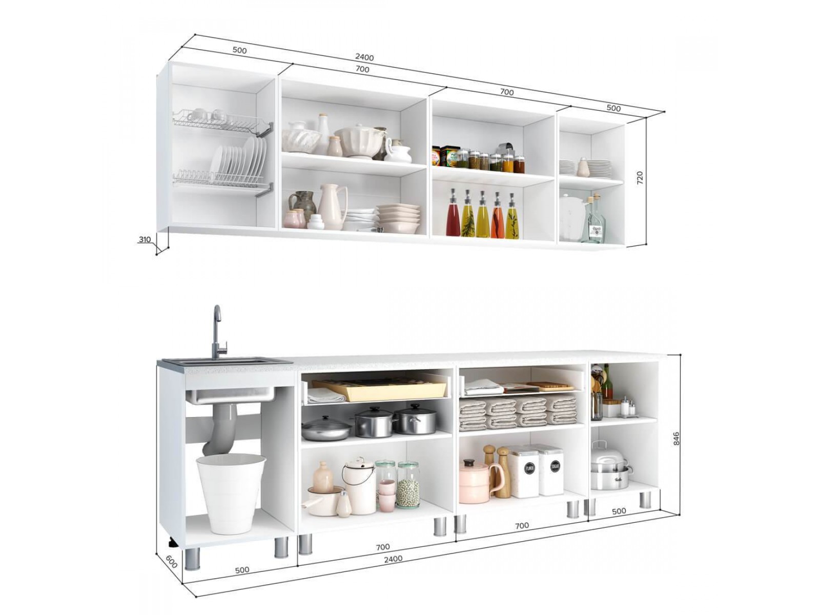 Габаритные размеры композиции нижних модулей с учётом столешницы: Ширина: 2400 мм. Высота: 846 мм. Глубина: 595 мм.