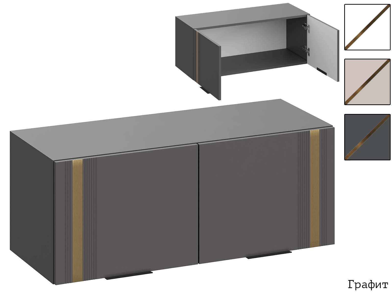 Фасады с оригинальной фрезеровкой изготовлены из МДФ и декорированы металлической полосой в цвете золото браш.