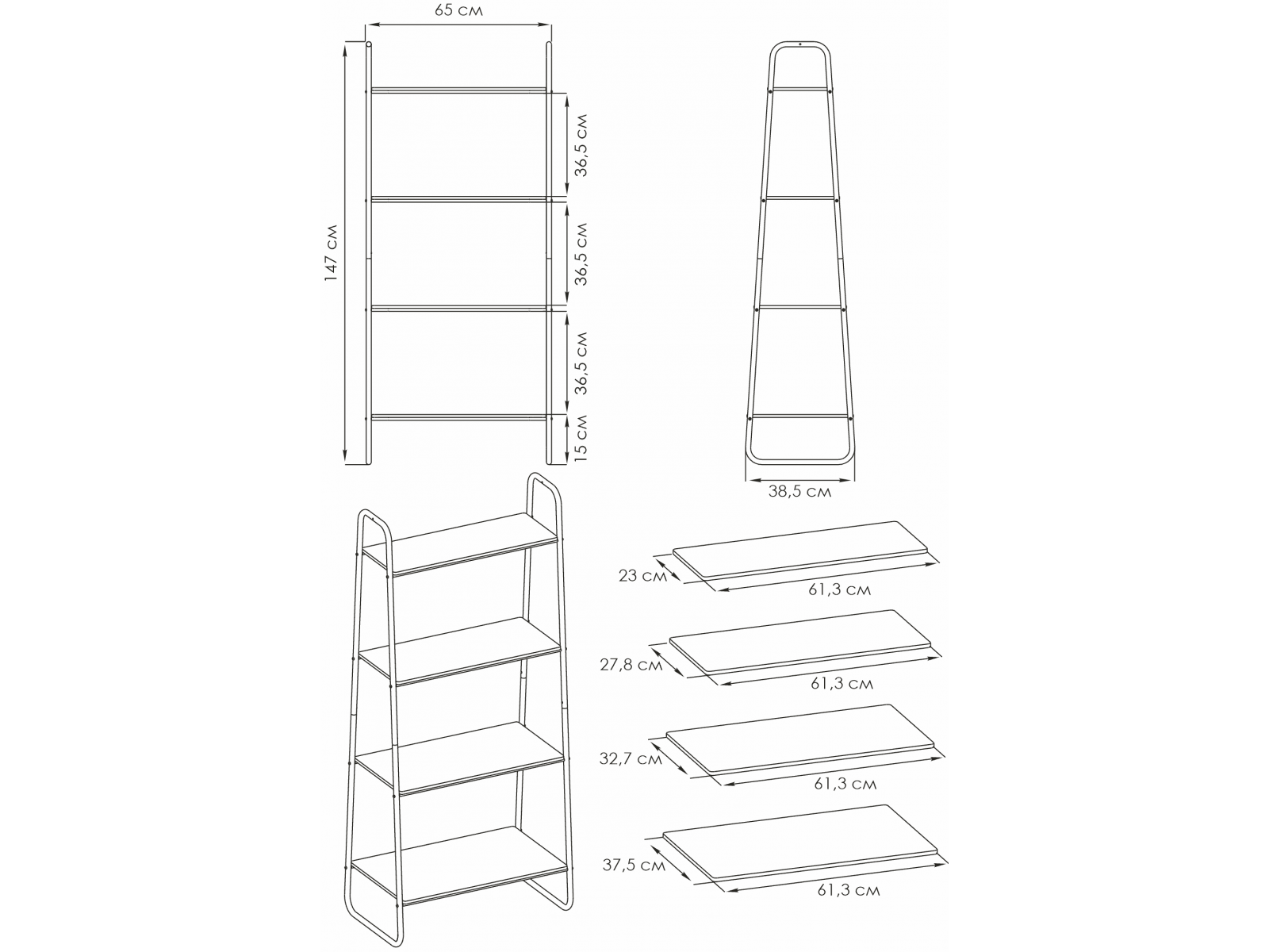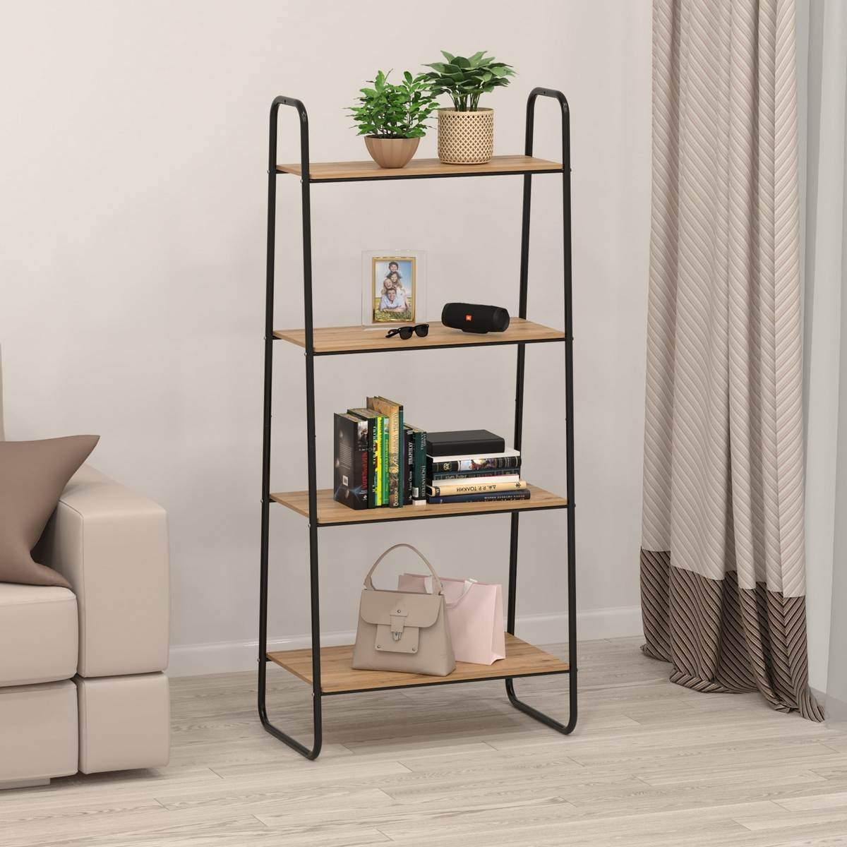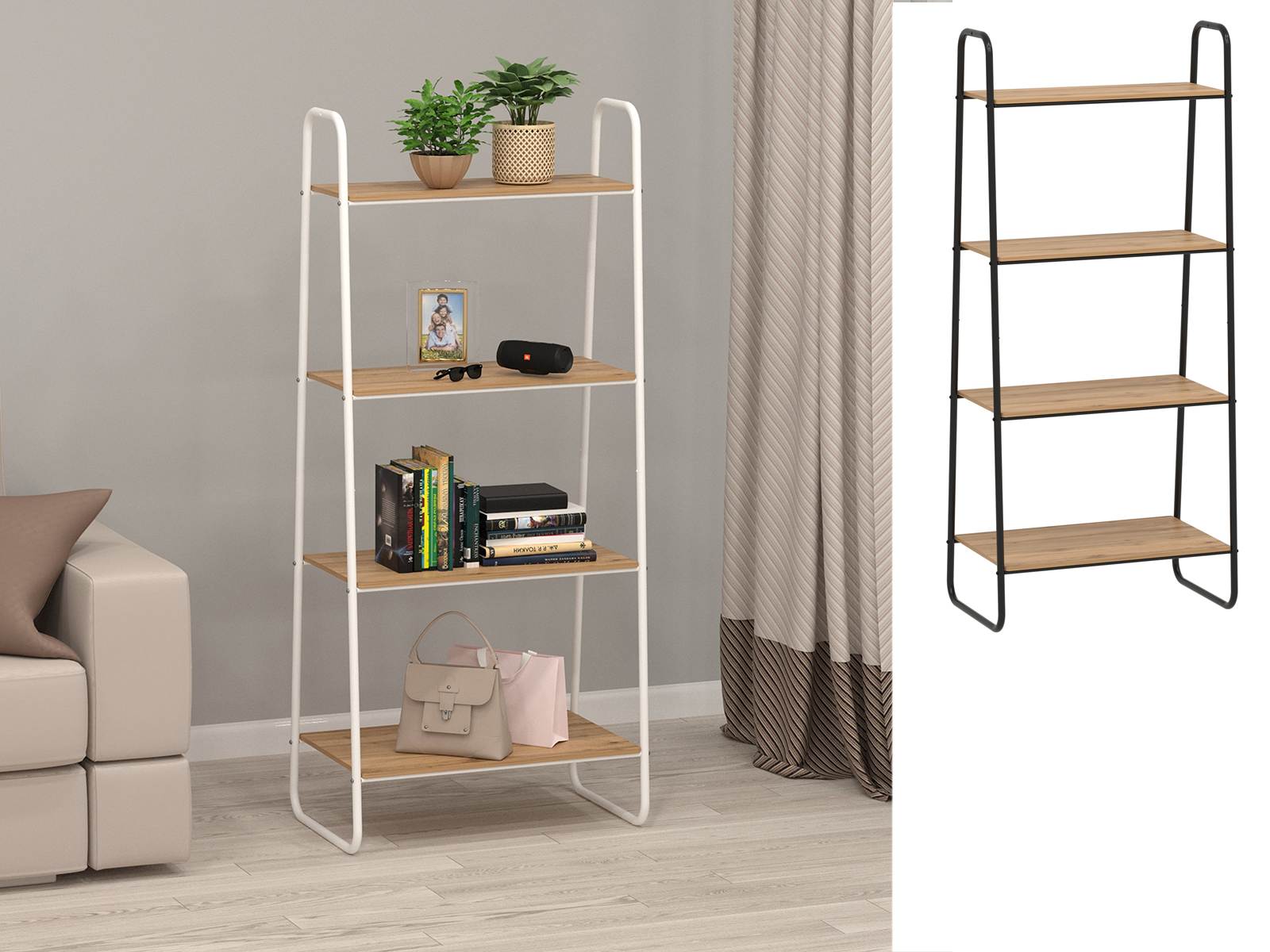 Открытая конструкция с полками для хранения.