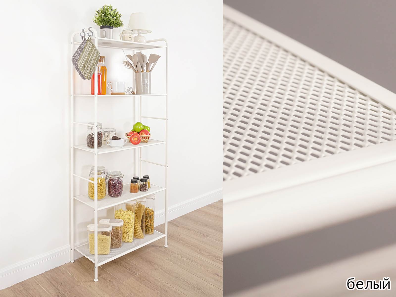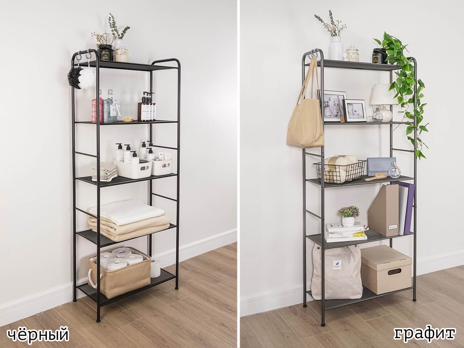 Открытая конструкция с полками для хранения.