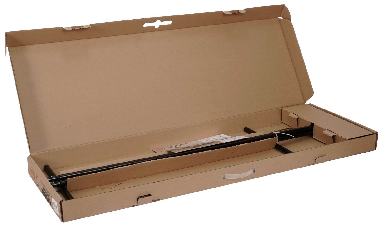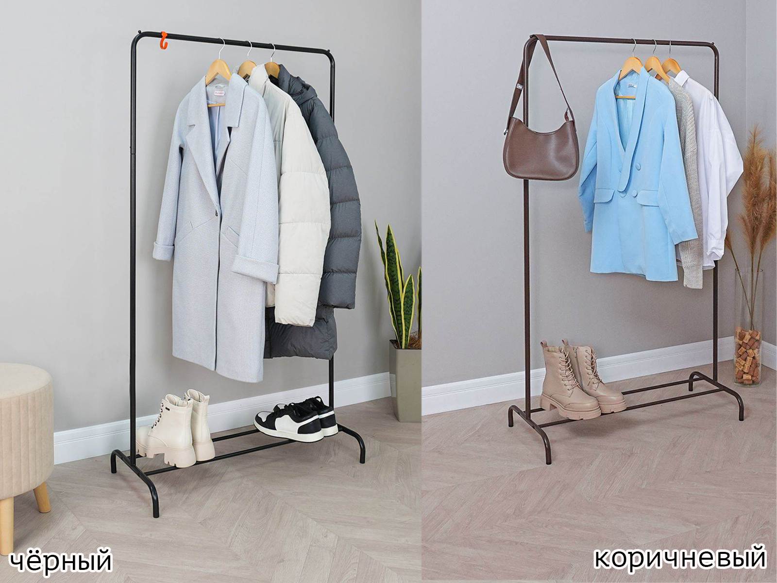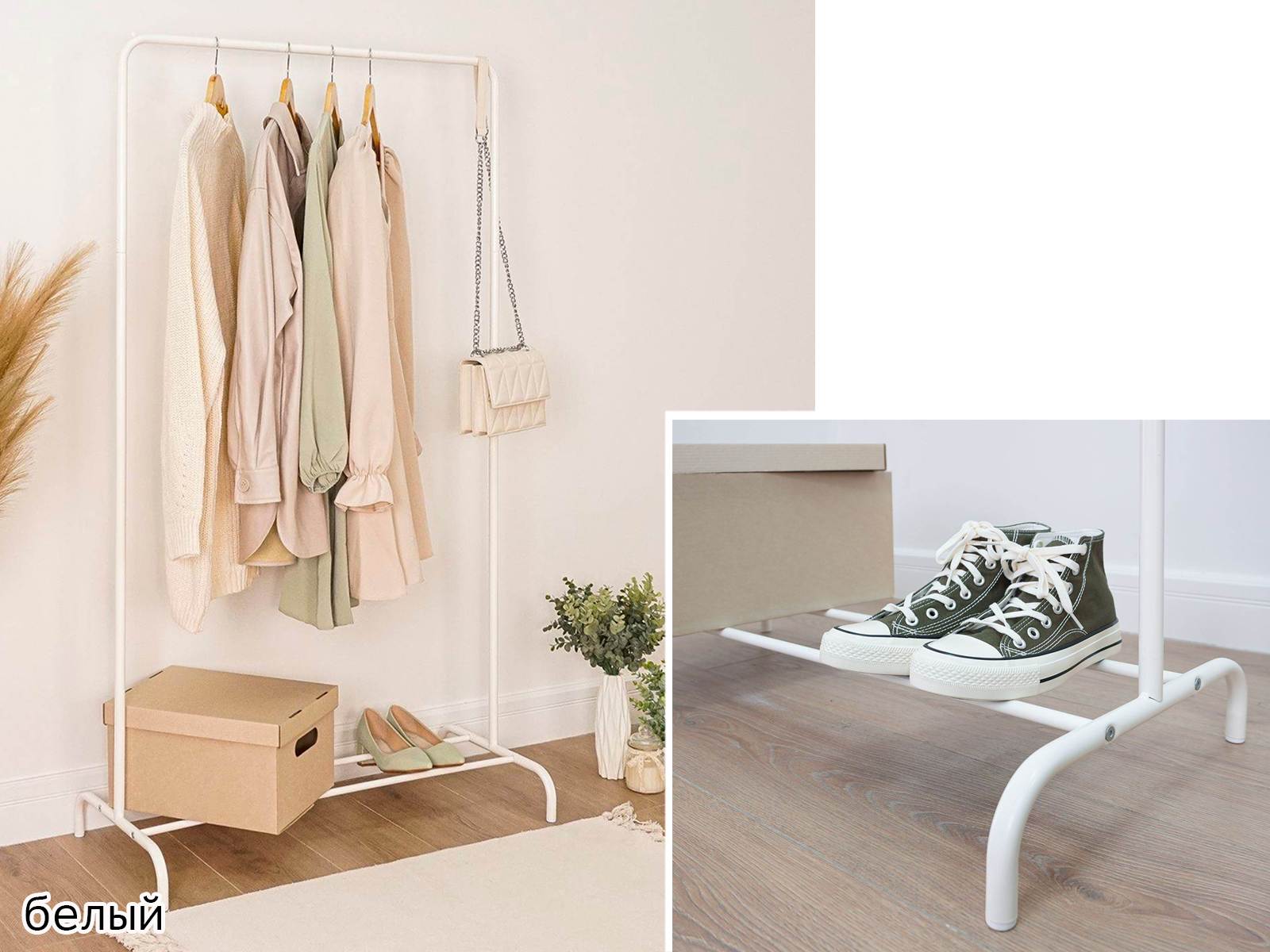 Открытая конструкция со штангой для плечиков с одеждой и полкой для обуви.