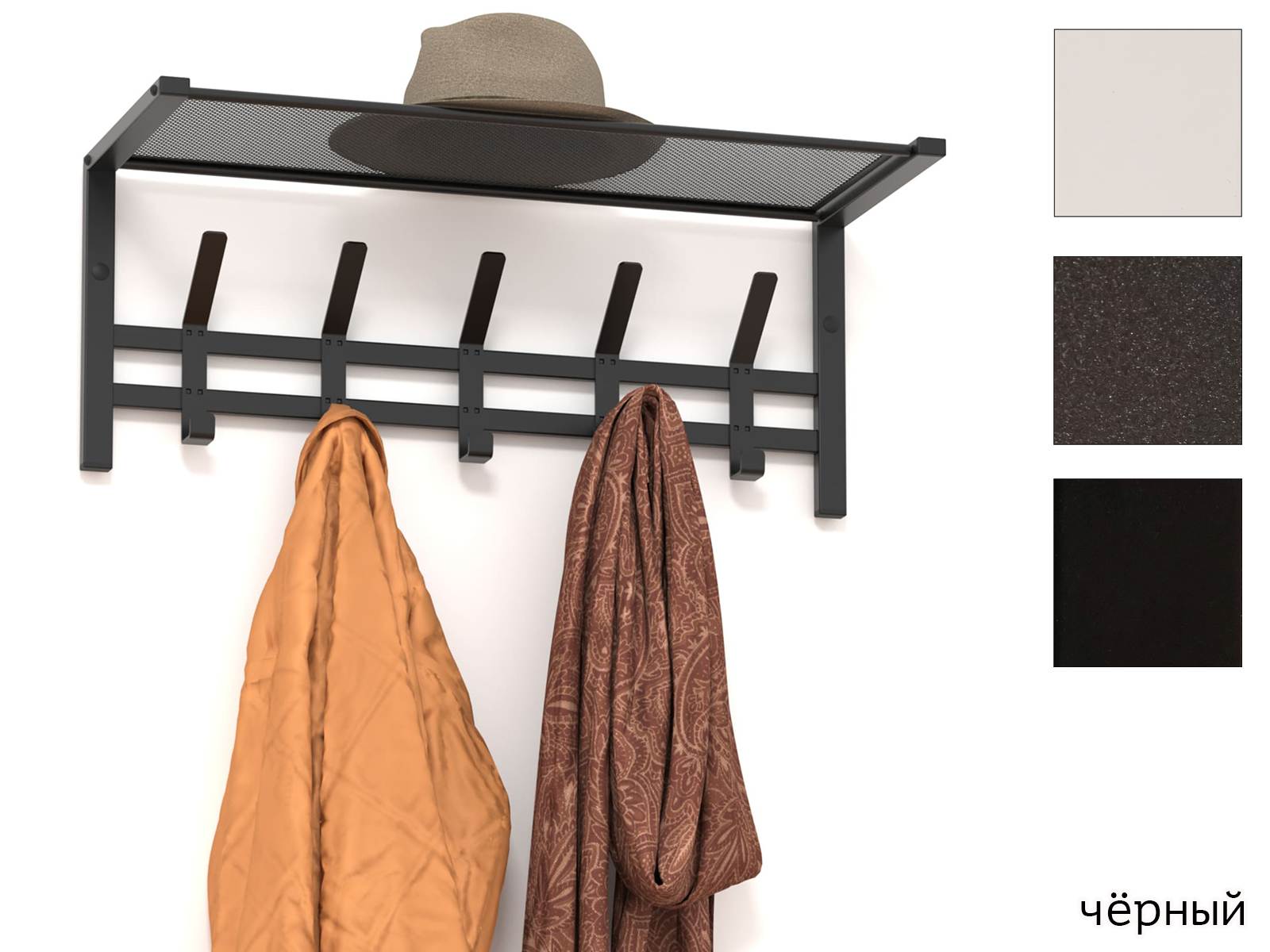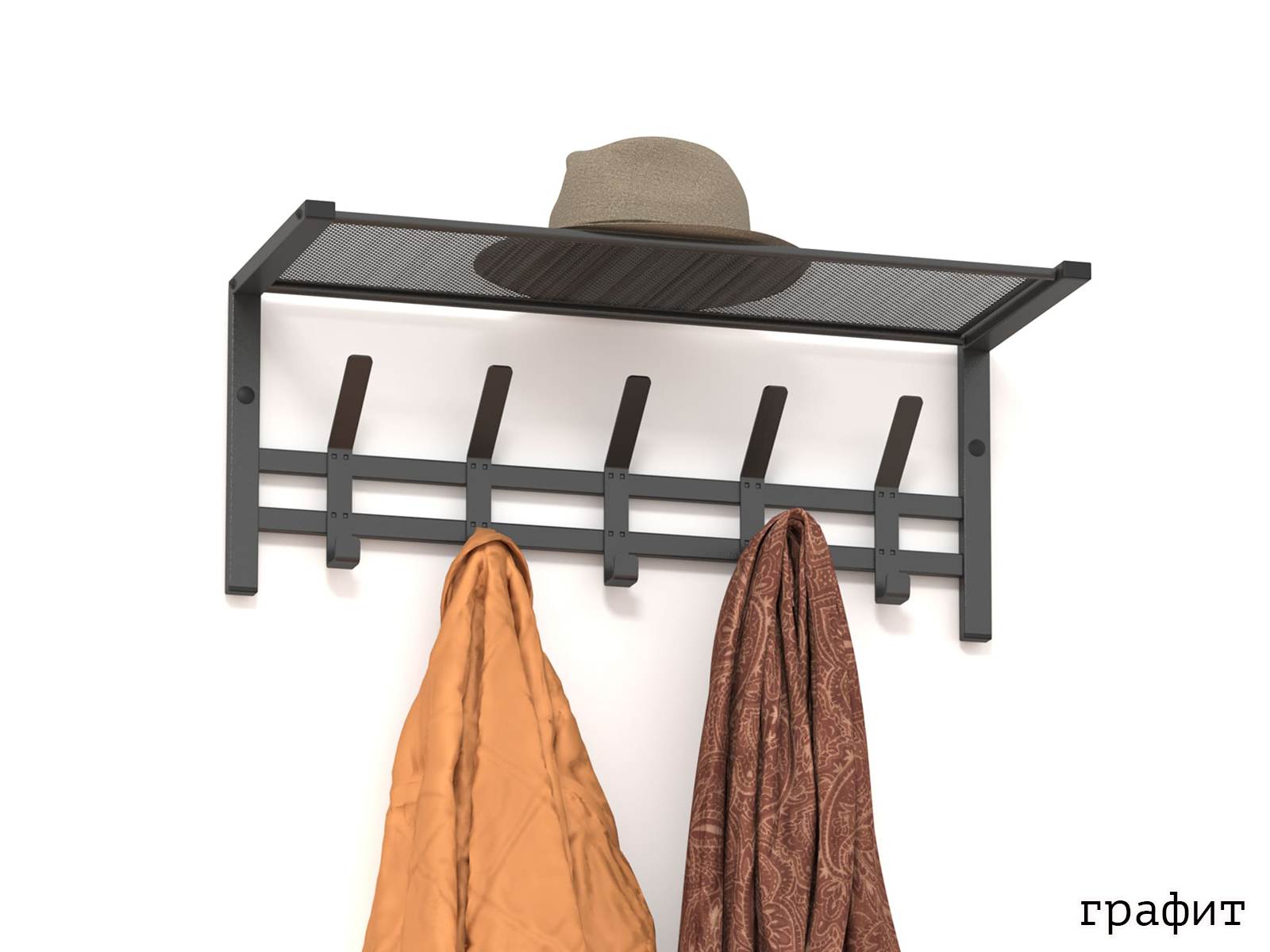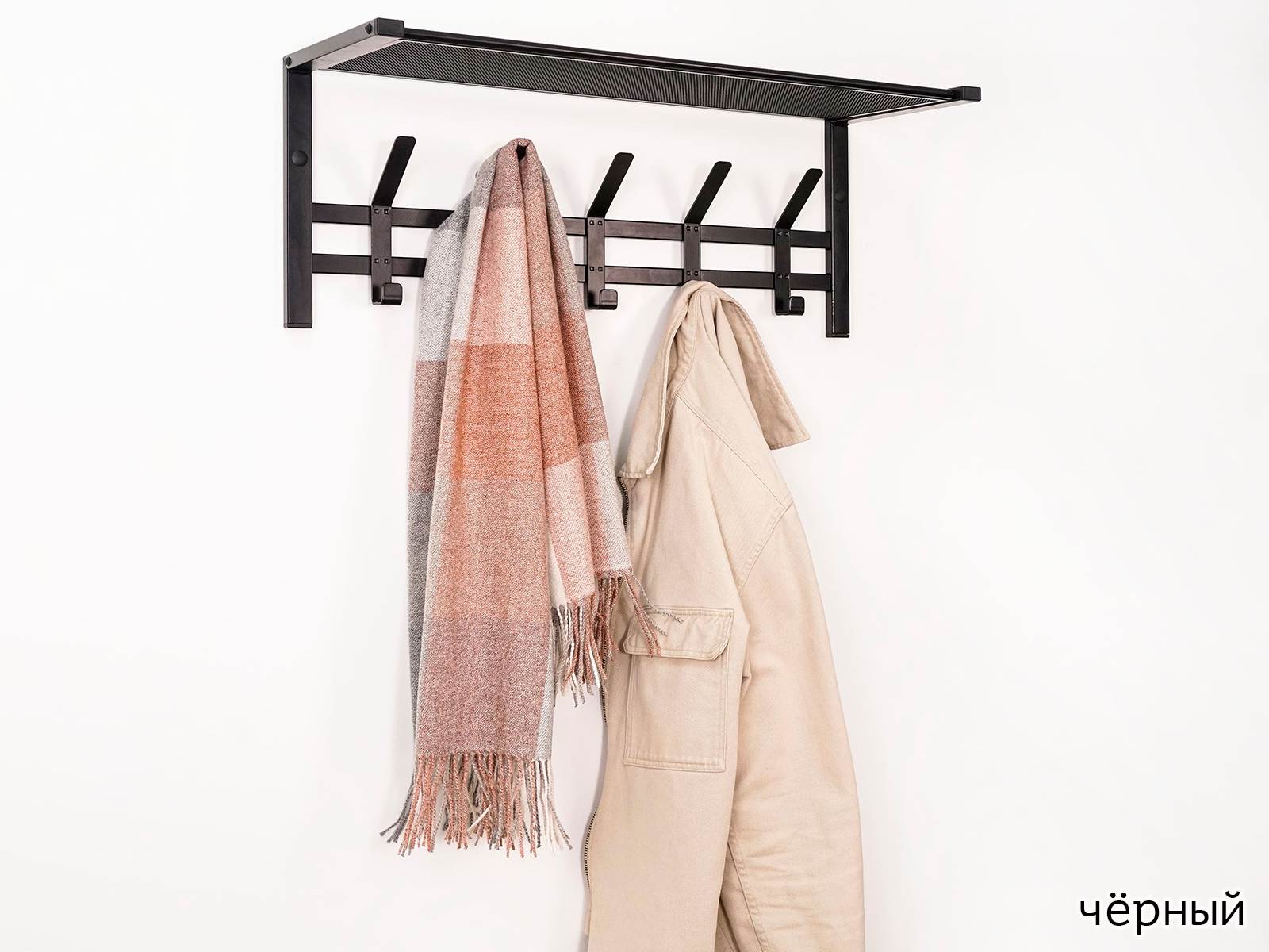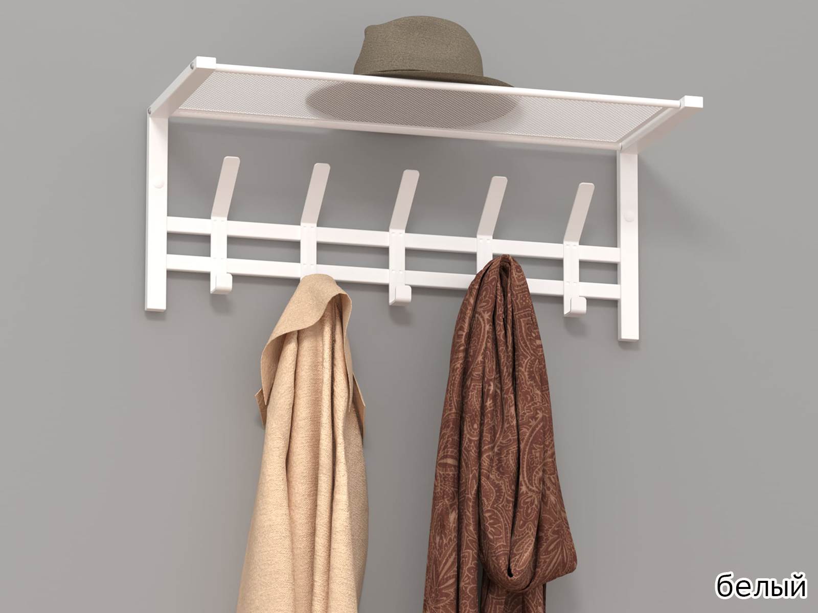 Конструкция с пятью крючками для одежды и полкой для головных уборов.