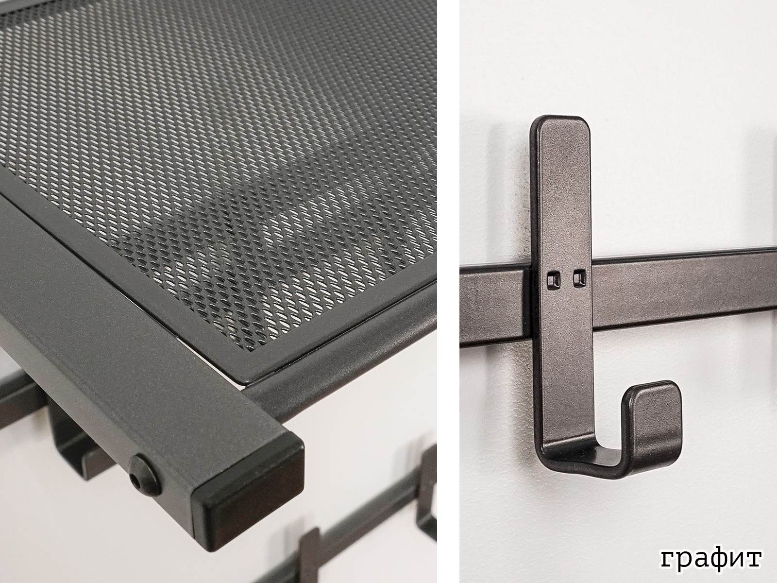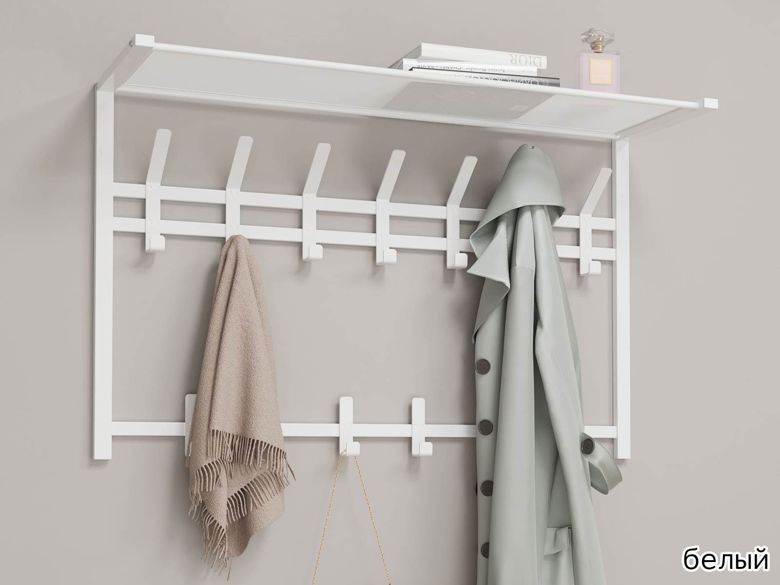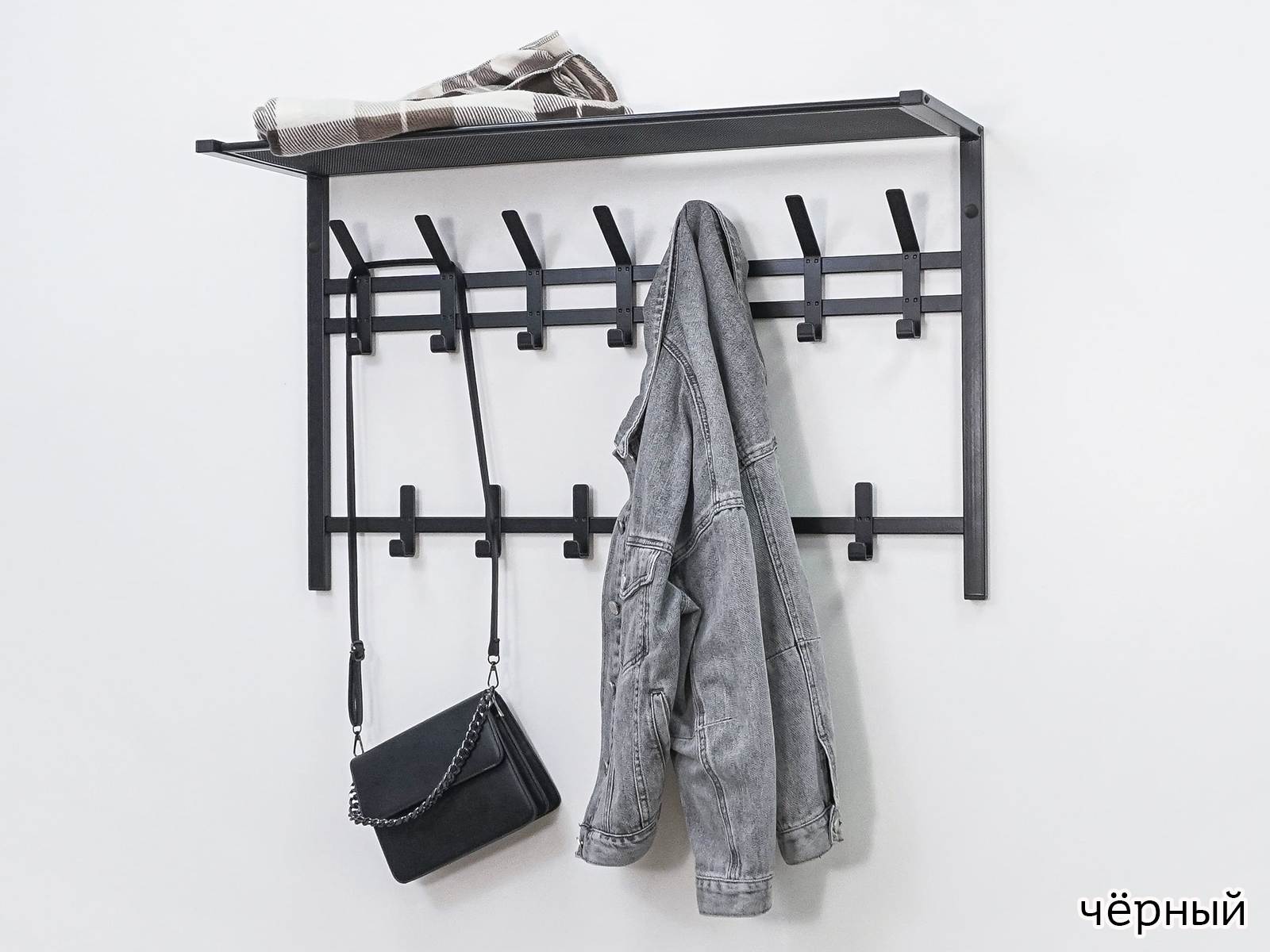 Конструкция с семью крючками для одежды, шестью крючками для сумок и полкой для головных уборов.