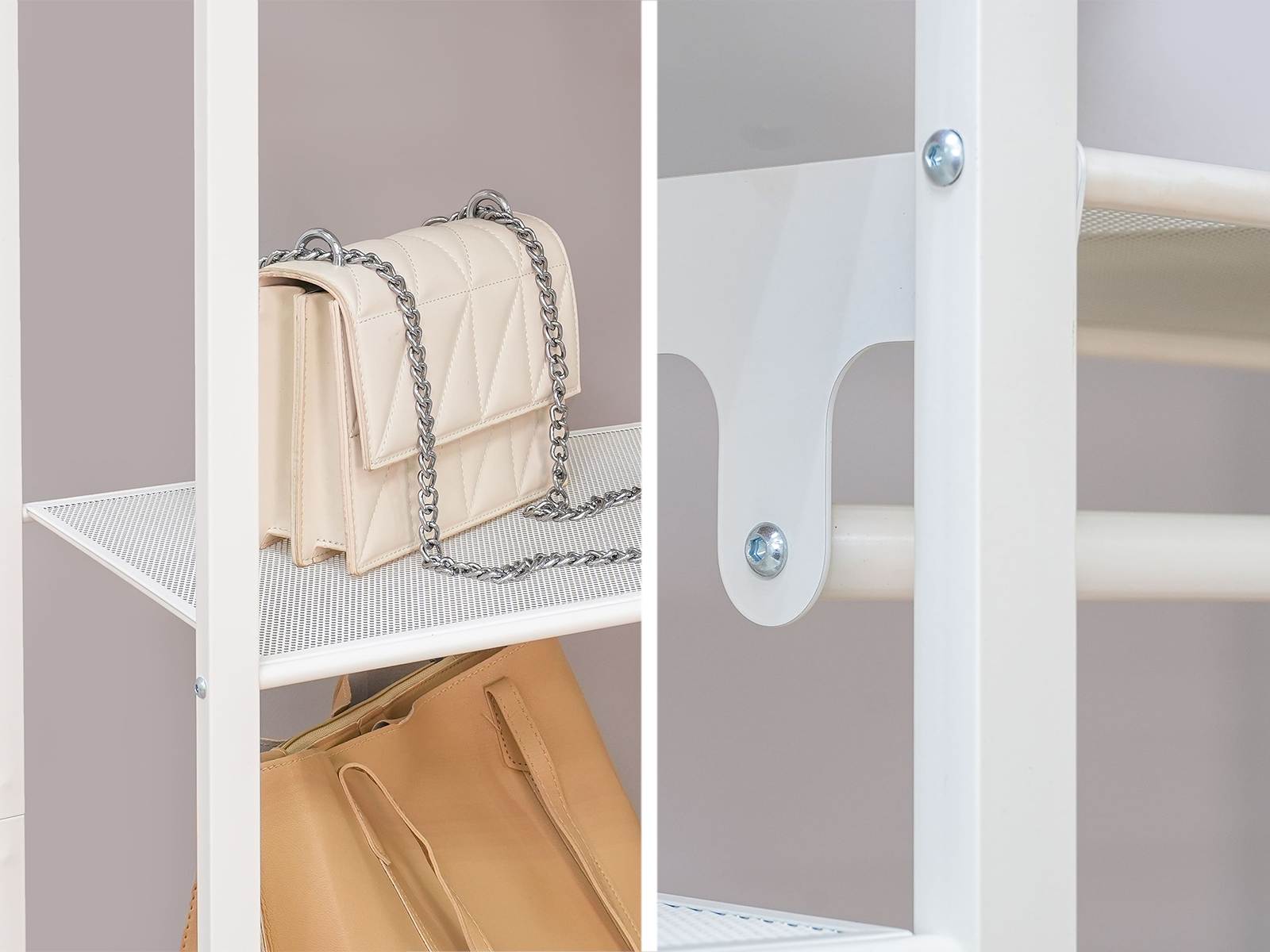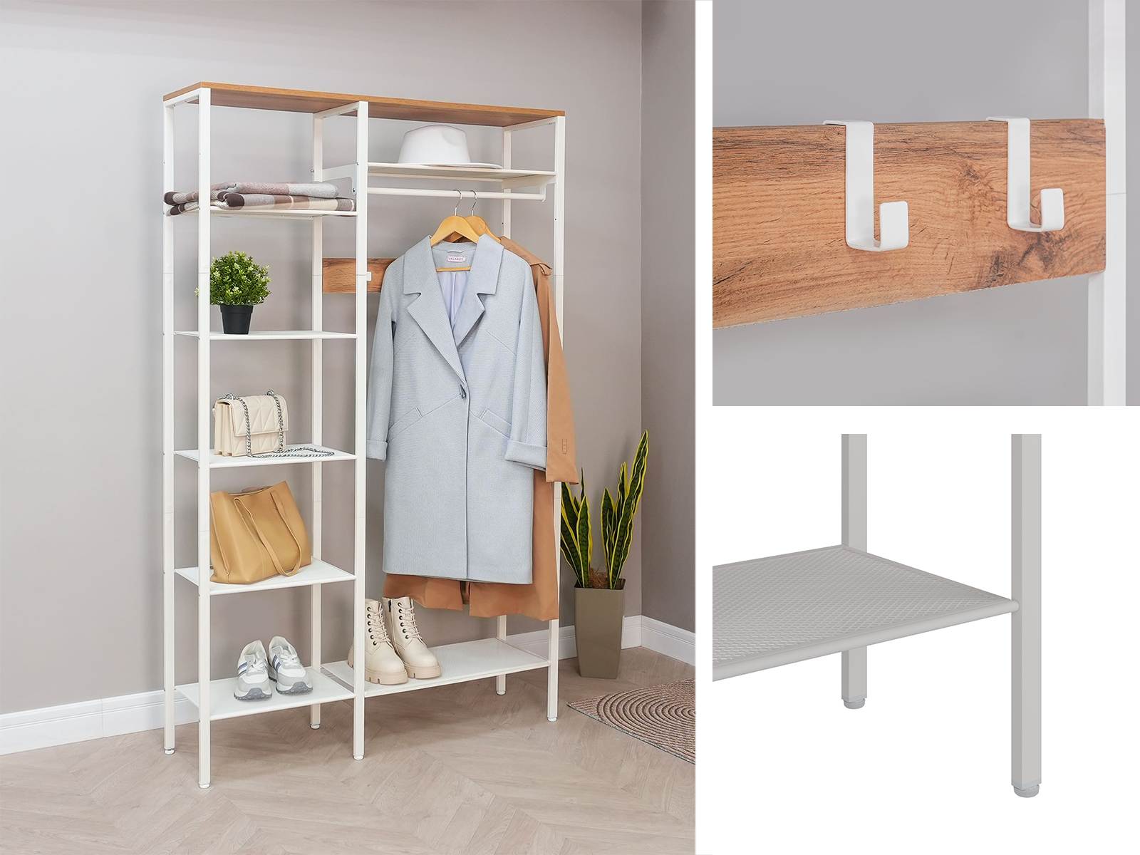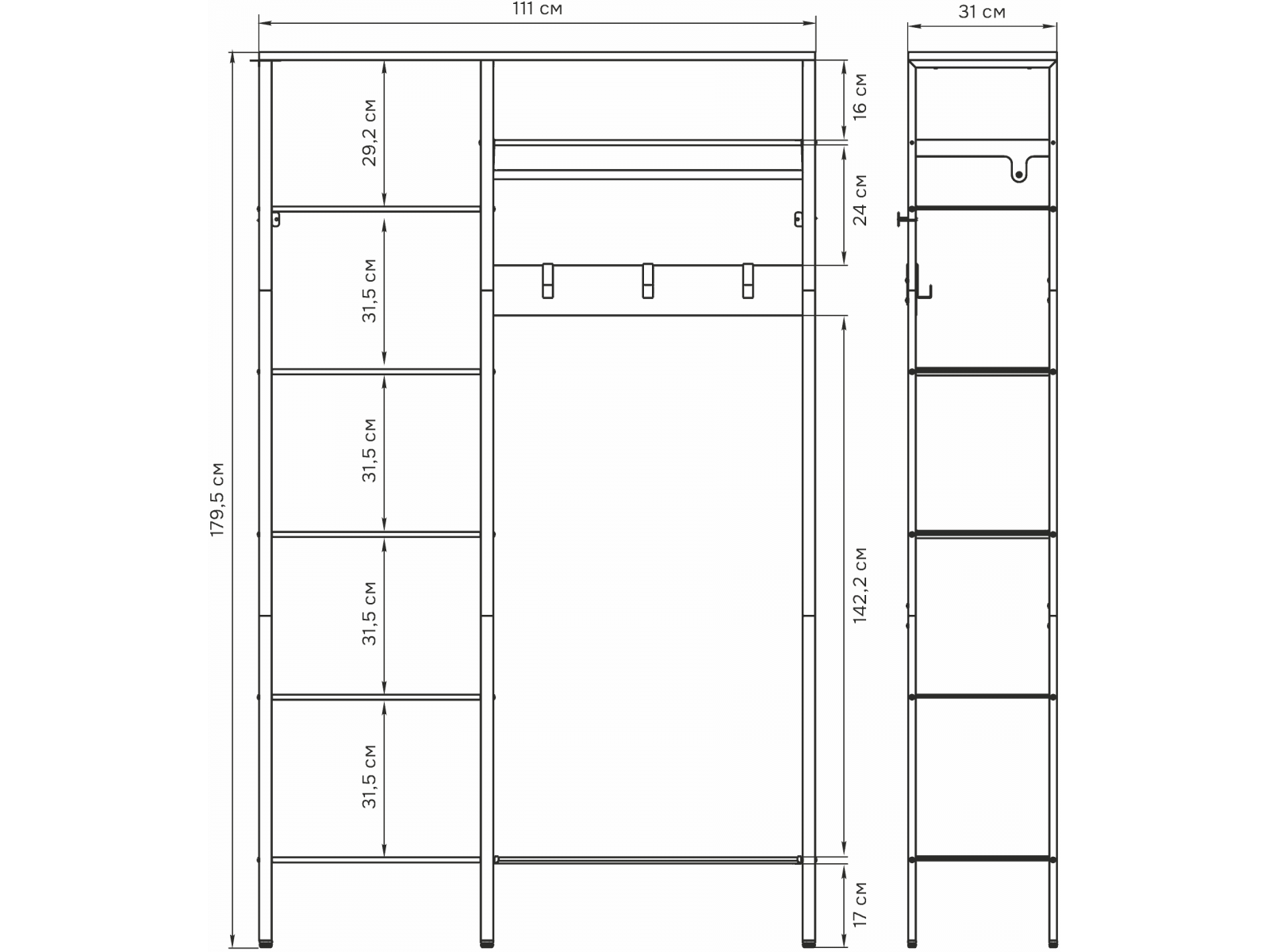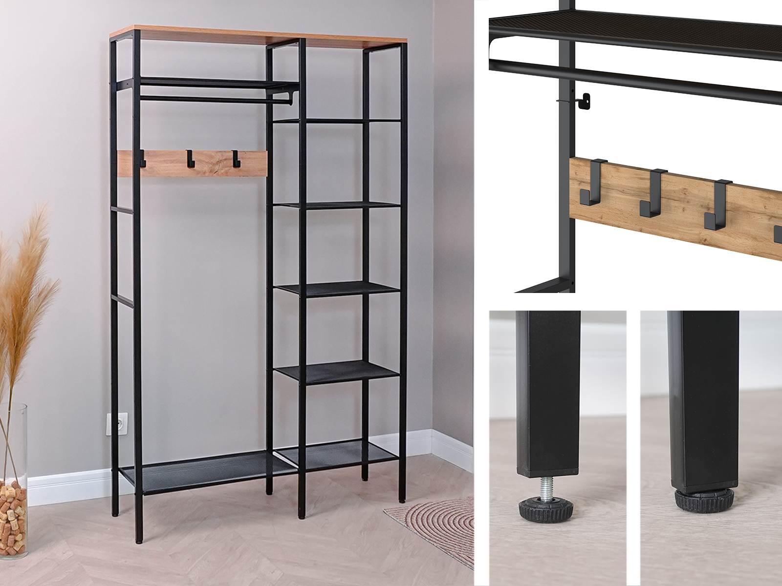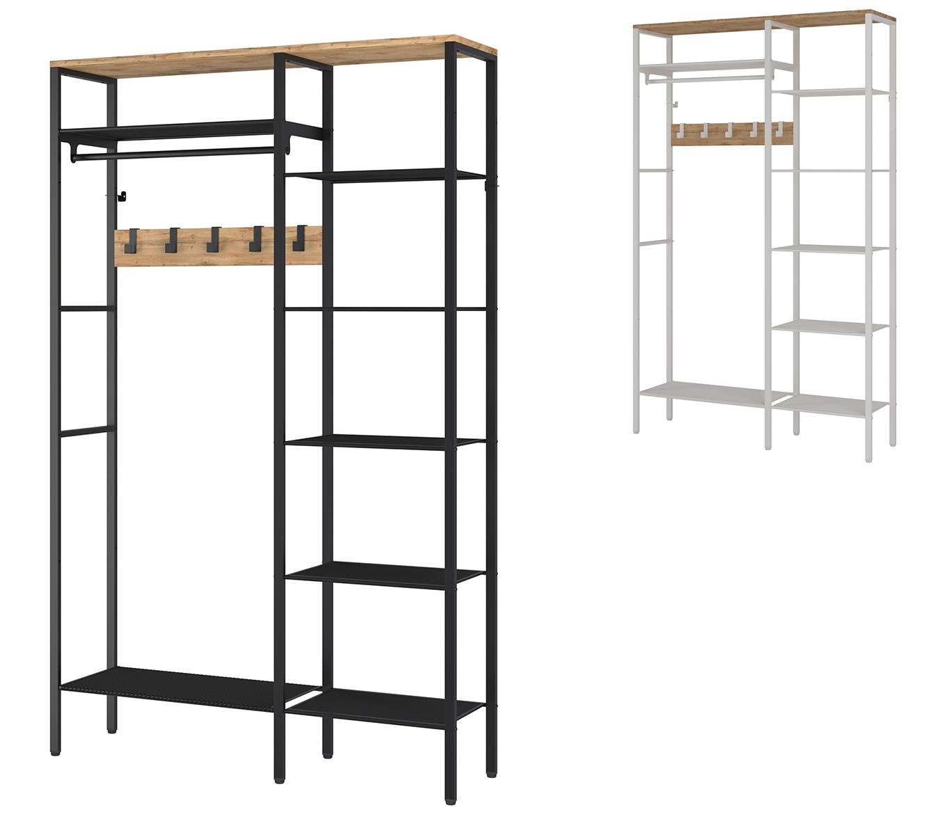 Открытая конструкция со штангой для плечиков с одеждой и семью полками для хранения.