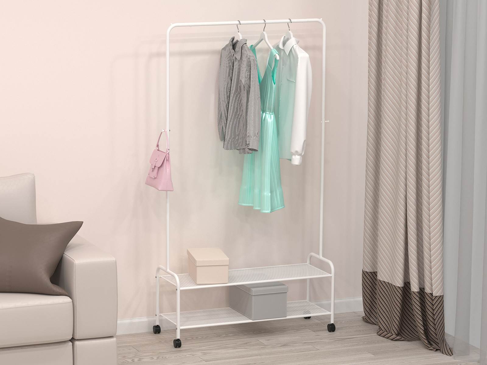 Открытая конструкция со штангой для плечиков с одеждой и двумя полками для хранения.