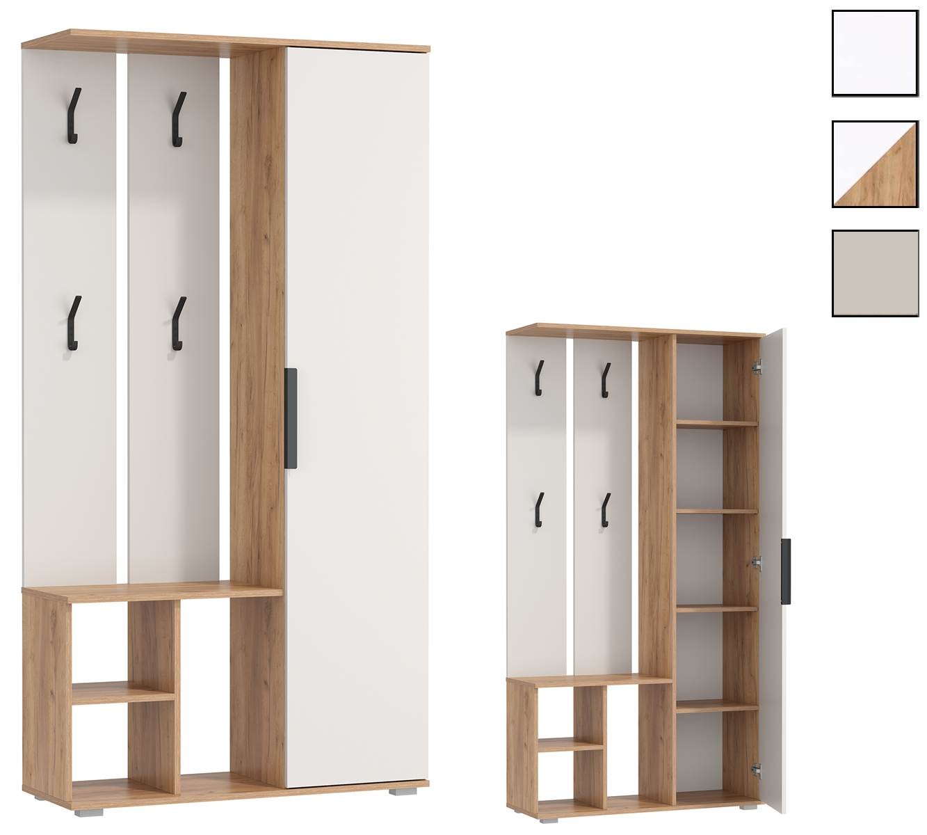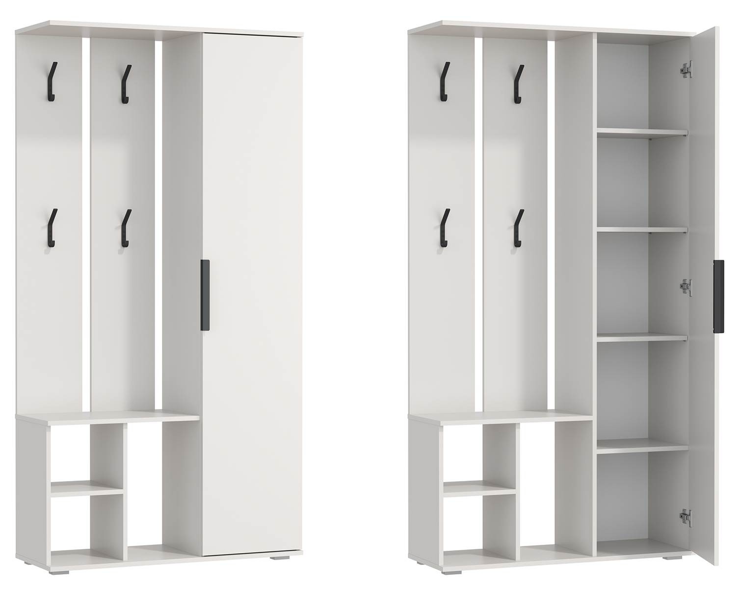 Имеются несколько секций: шкаф для одежды, вешалка с крючками, тумба для обуви.