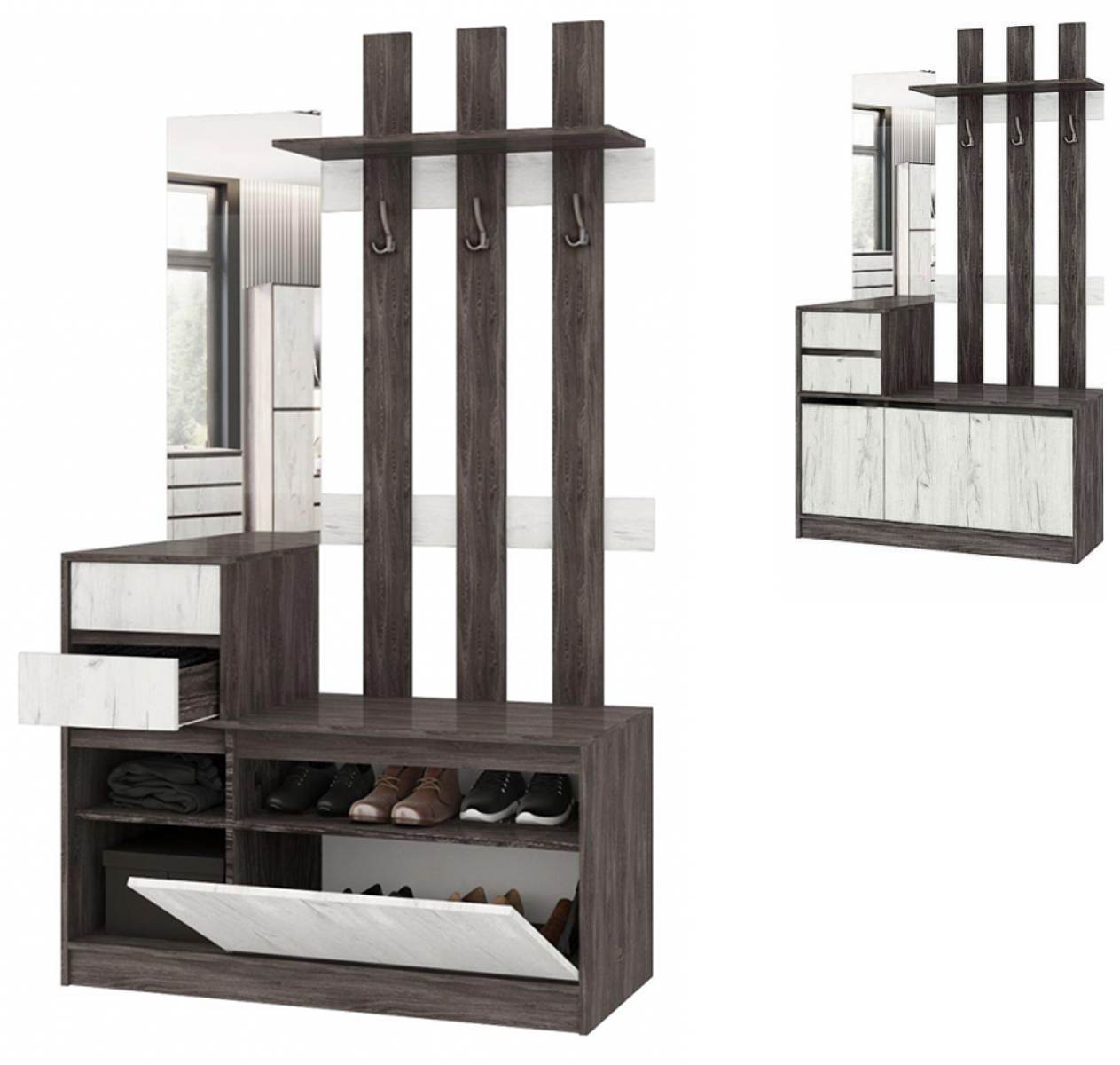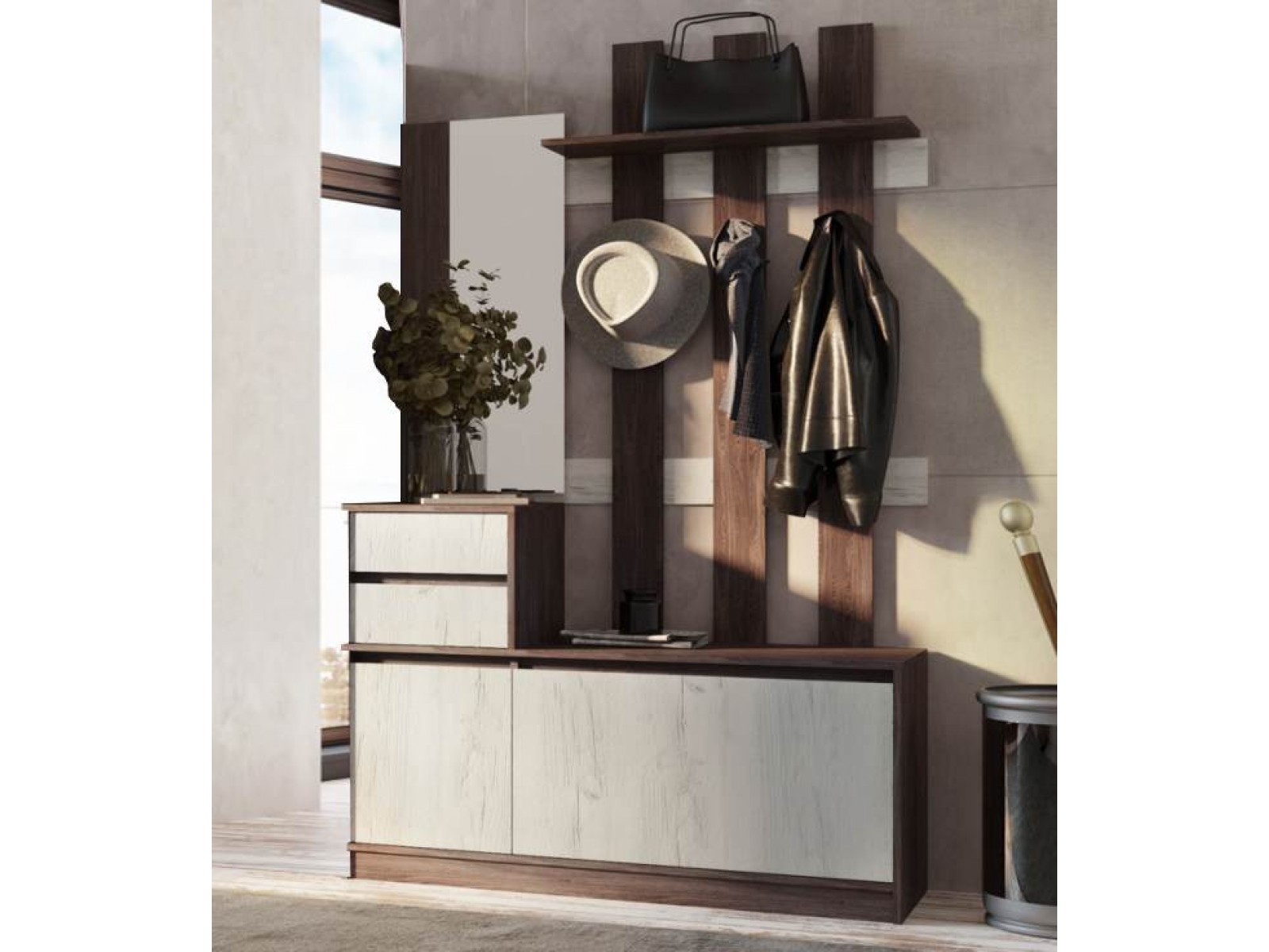 Прихожая Милана - подходящее решение для малогабаритных прихожих, холлов или офисов. Этот оригинальный и многофункциональный модуль состоит из вешалки для одежды, антресольной полки под головные уборы, полки под обувь и ящика для различных мелочей. Одна такая прихожая решит все вопросы хранения в Вашей прихожей.