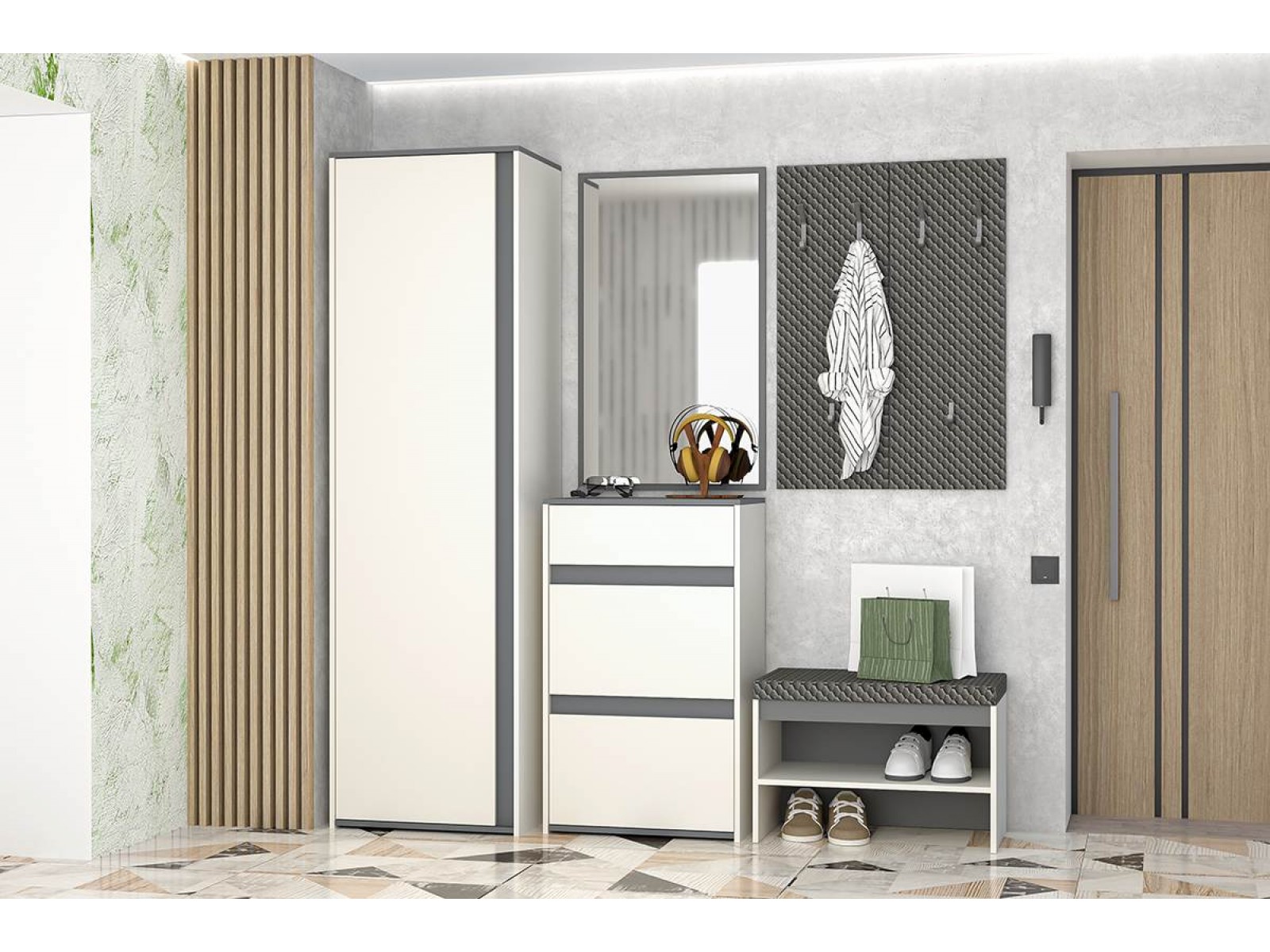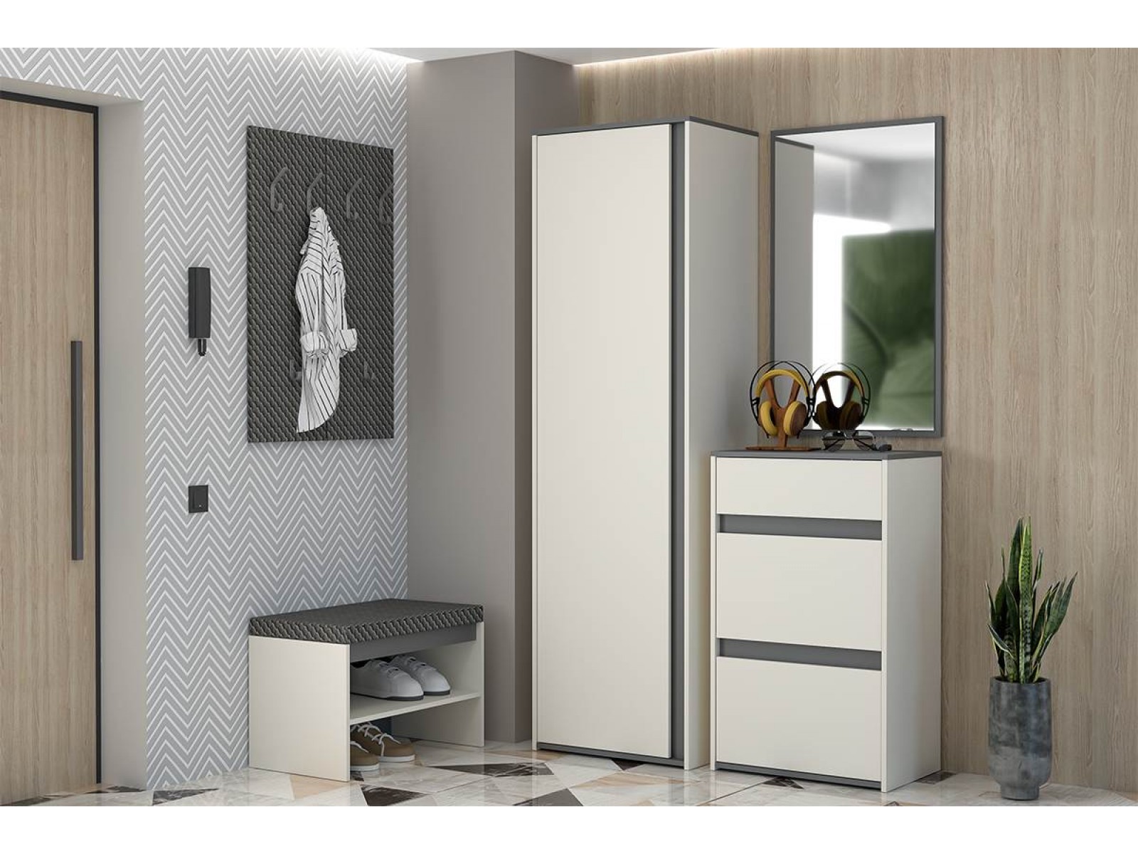Маленькая прихожая Иннэс 12 - идеальное решение для компактного помещения. Светлые фасады визуально расширяют пространство, наполняя его воздухом и светом, а контрастные элементы графитового цвета подчёркивают строгость и лаконичность.
