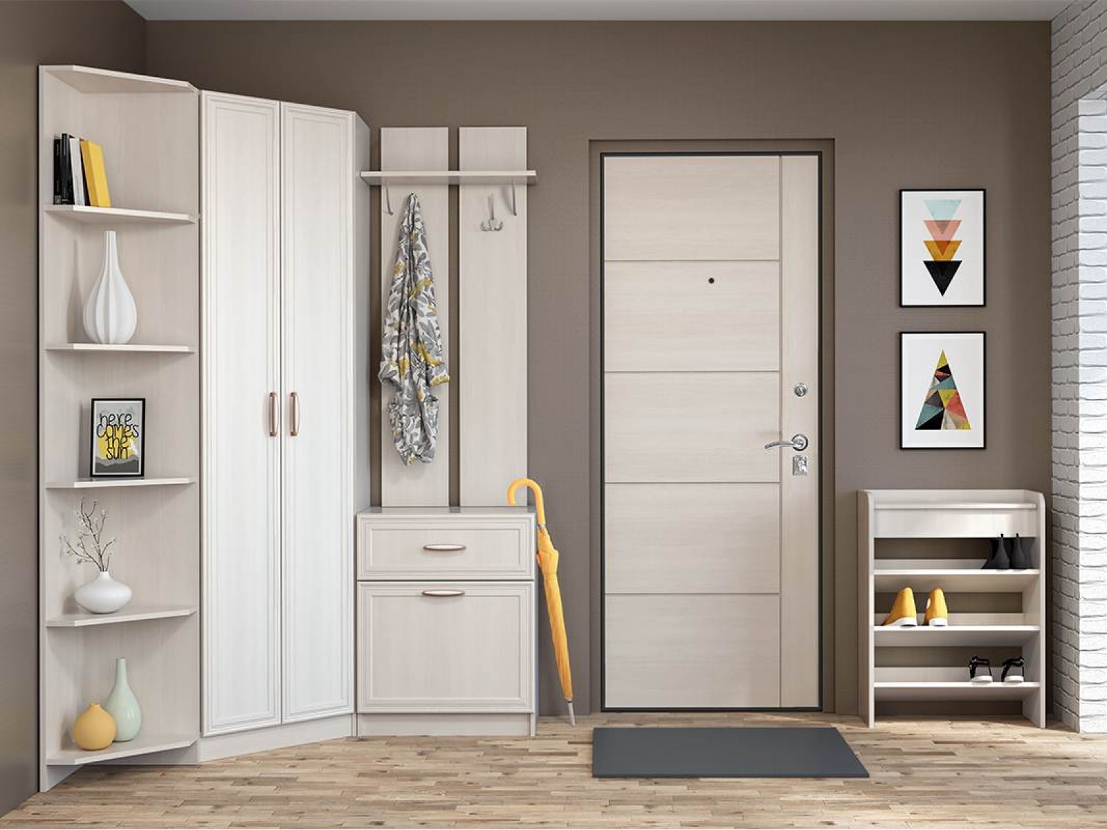 - Вешалка (антресольная полка для головных уборов, два трёхрожковых крючка для одежды) с обувницей (выдвижной ящик и ниша с откидной створкой), 600х2100х390 мм;