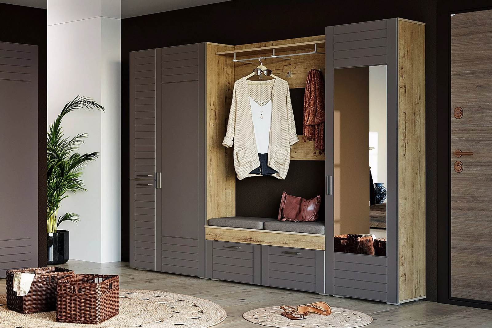 Прихожая Livorno 1 дуб бунратти + софт графит - ультра современный модульный набор мебели для прихожей комнаты.