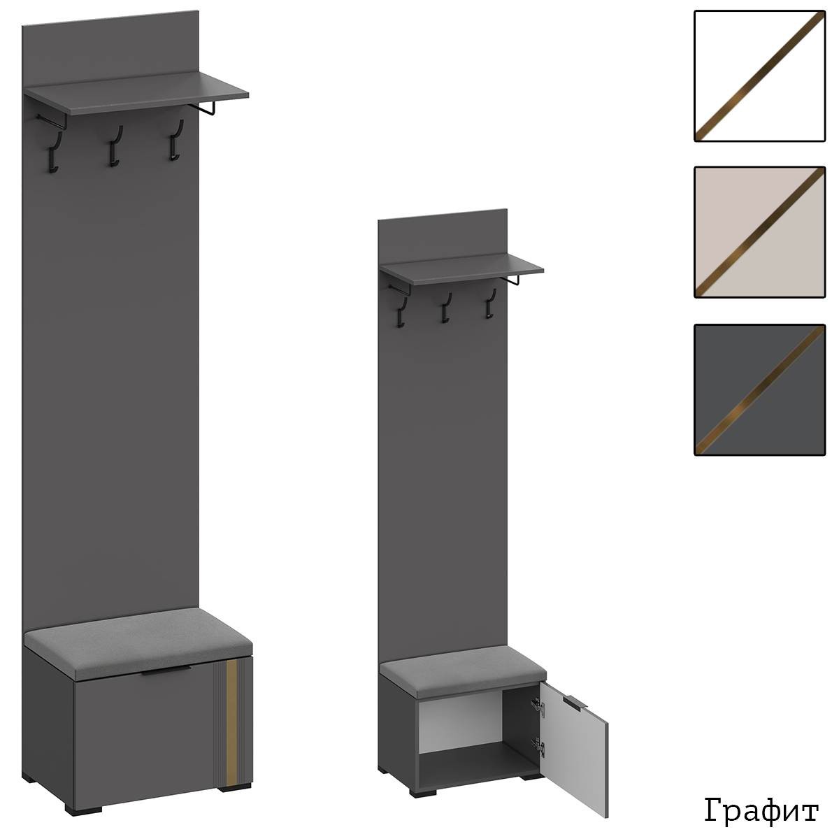 Фасады с оригинальной фрезеровкой изготовлены из МДФ и декорированы металлической полосой в цвете золото браш.