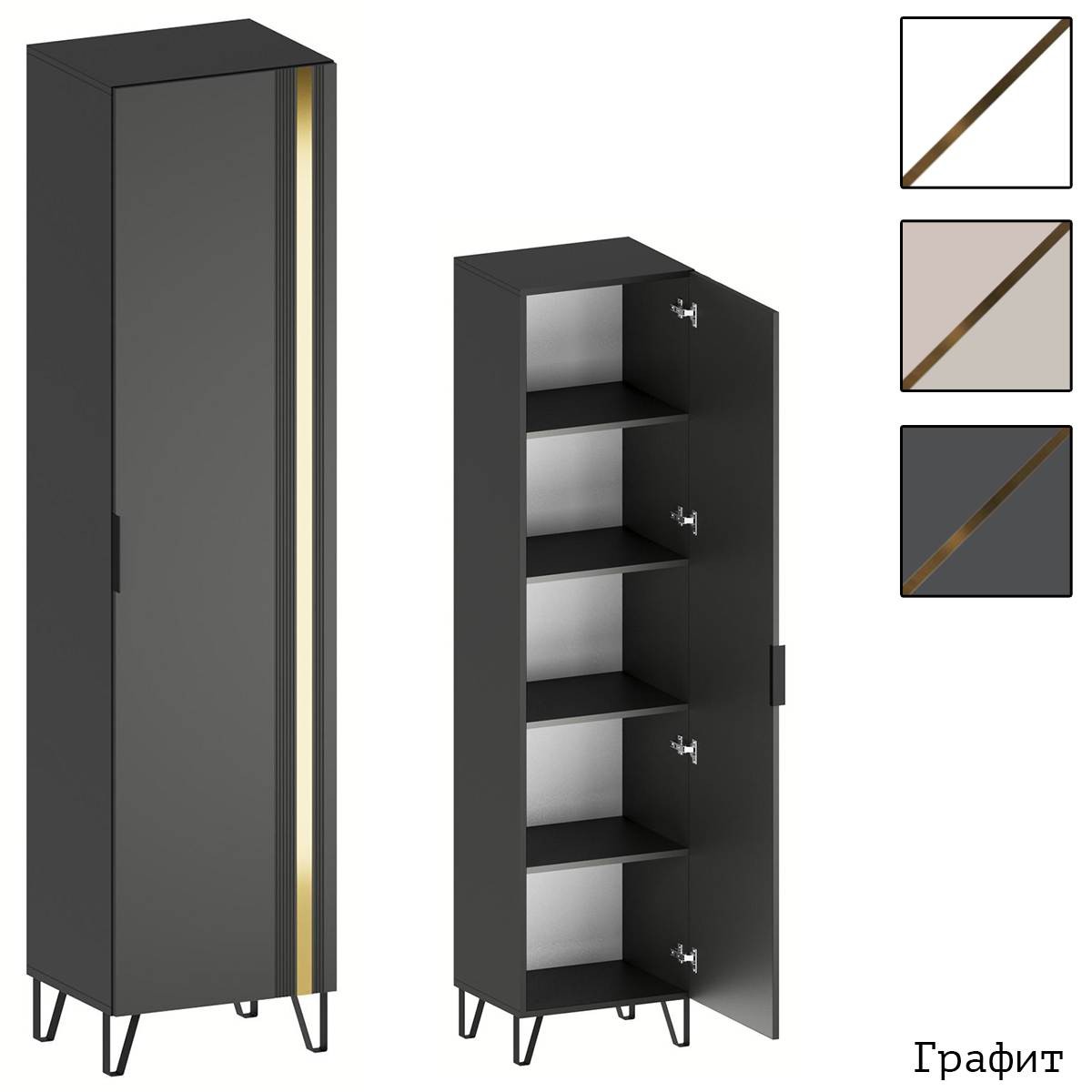 Фасады с оригинальной фрезеровкой изготовлены из МДФ и декорированы металлической полосой в цвете золото браш.