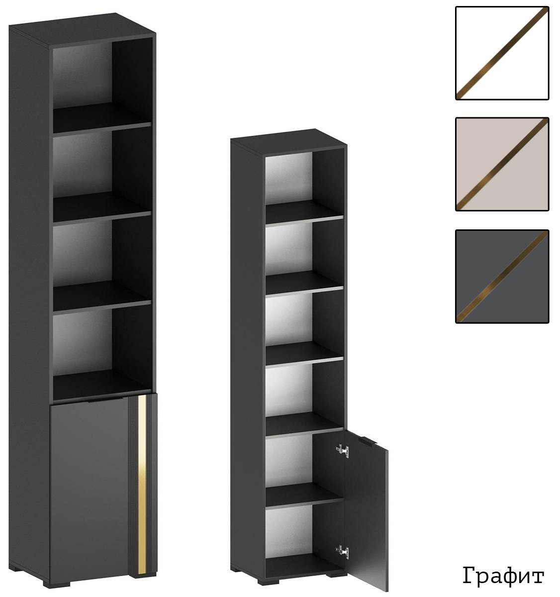 Фасады с оригинальной фрезеровкой изготовлены из МДФ и декорированы металлической полосой в цвете золото браш.