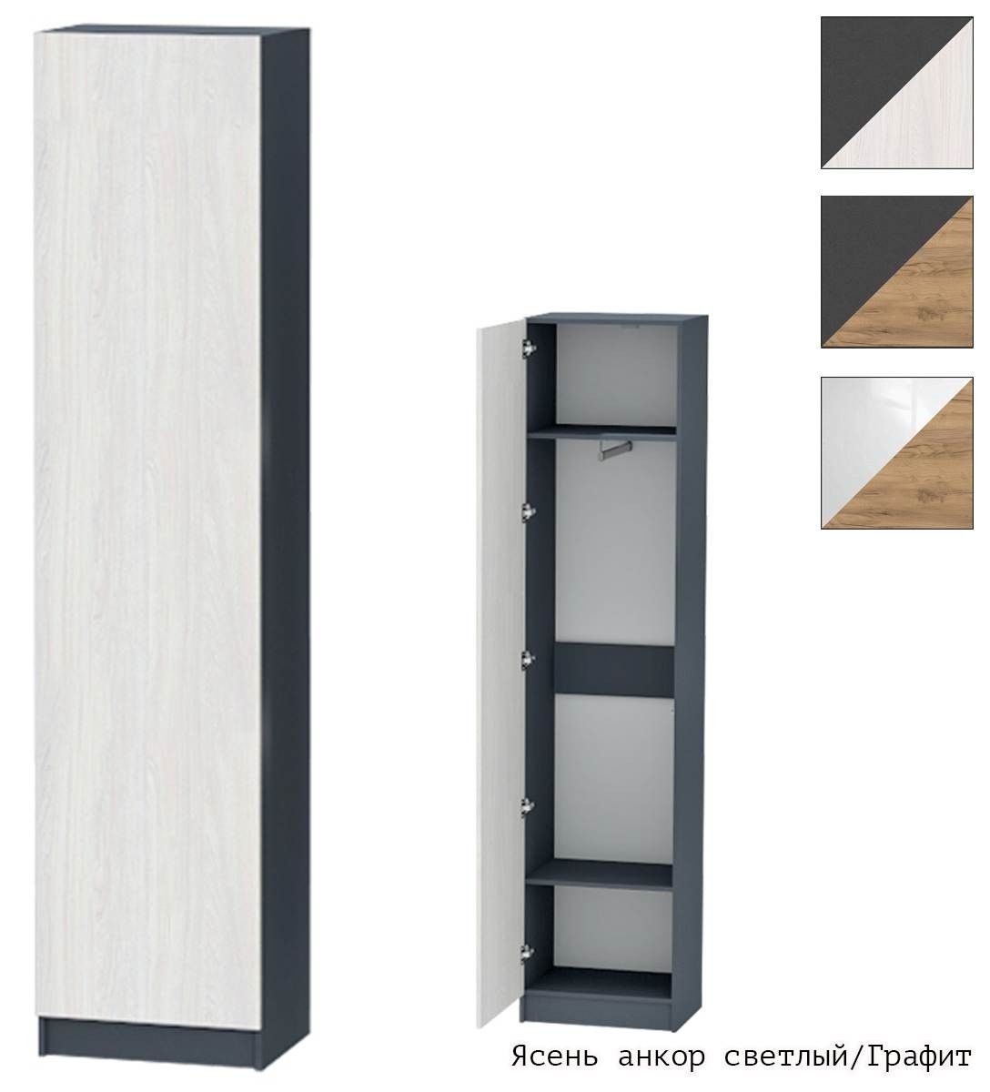 За распашной створкой находятся: две полки и выдвижная штанга для одежды.