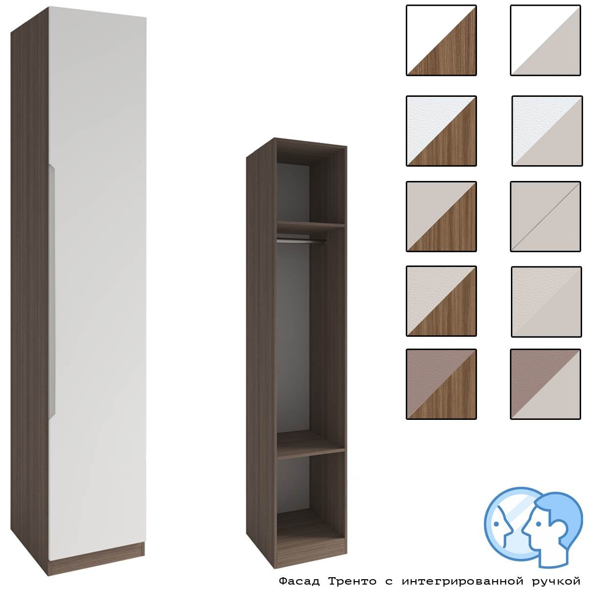 Направляющие скрытого монтажа. Данная фурнитура позволит создать эстетичный вид, обеспечив плавное и тихое закрывание ящиков без особых усилий. Высокая надёжность позволит выдержать повышенные нагрузки. На каждый шкаф допустима установка от одного до четырёх ящиков. Базовая комплектация состоит из двух полок и одной штанги.