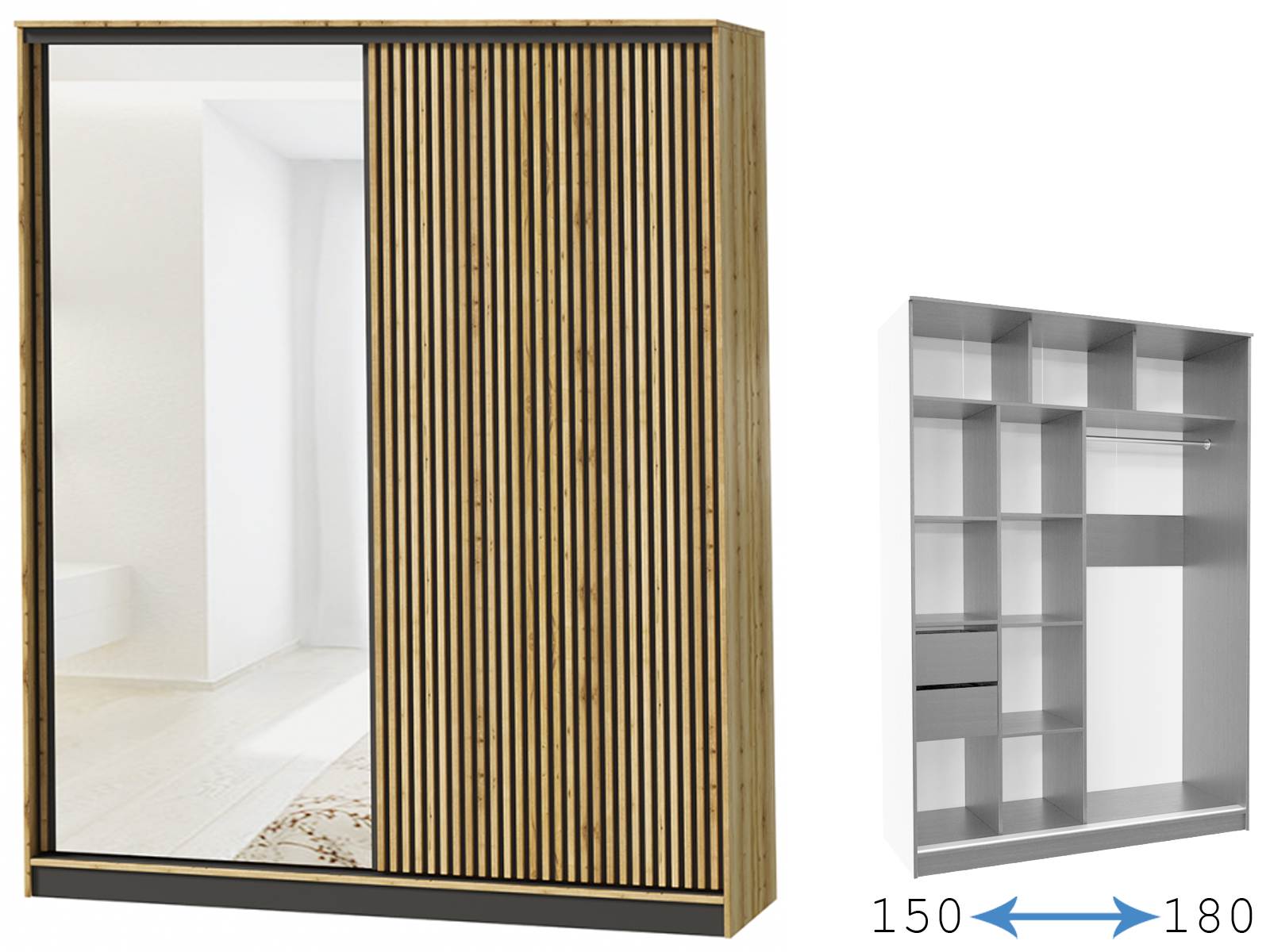 Ширина 1500 или 1800 мм обеспечивает достаточно места для одежды, обуви и аксессуаров. Современный дизайн легко впишется в интерьер любого стиля, а раздвижные двери экономят пространство и добавляют удобство в использовании.
