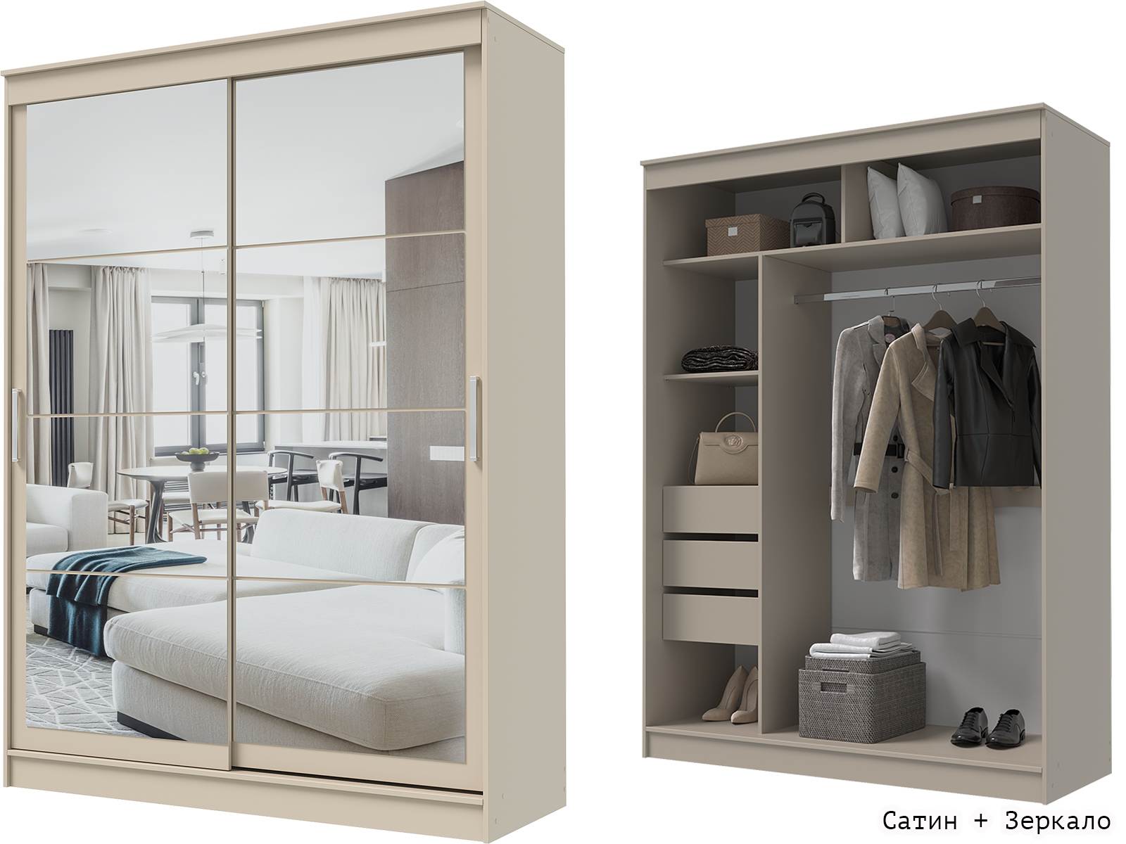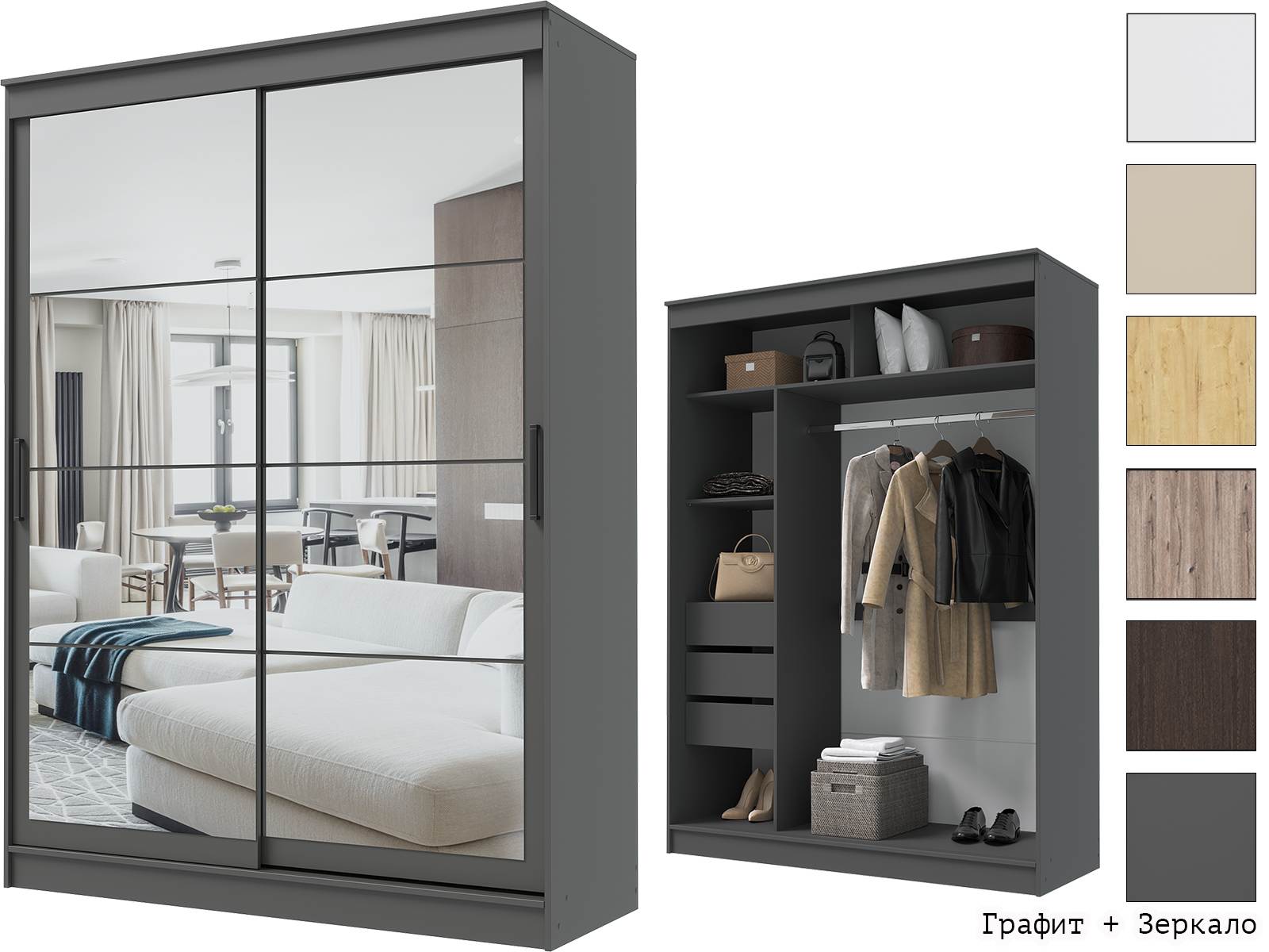 Шкаф-купе Гранд-1 - стильная и функциональная модель с продуманным наполнением. Предусмотрена вместительная ниша со штангой и отделение с полками. Небольшие выдвижные ящики удобны для аксессуаров и различных мелочей.