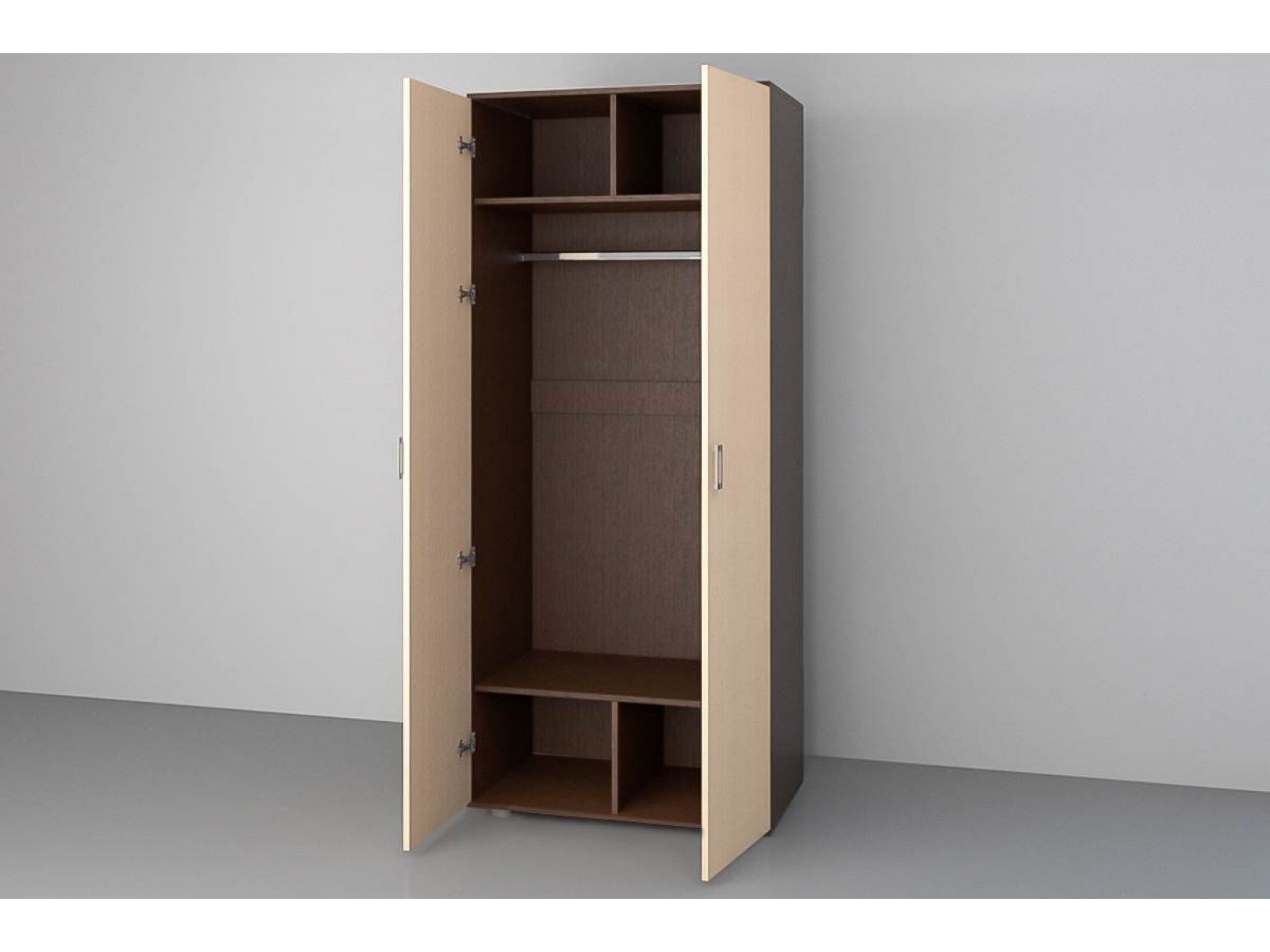 Шкаф двухстворчатый довольно хорошо впишется в любой современный интерьер. Его преимущества: хорошая вместимость, компактность, универсальность. За распашными дверями находятся: полки и металлическая штанга для одежды.