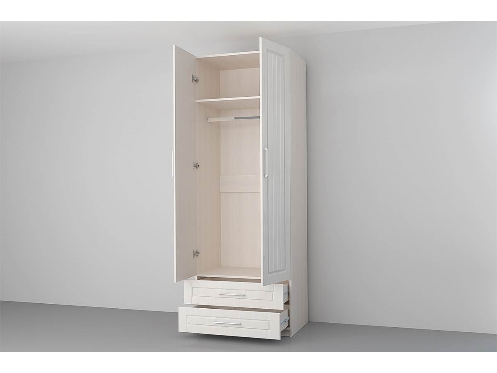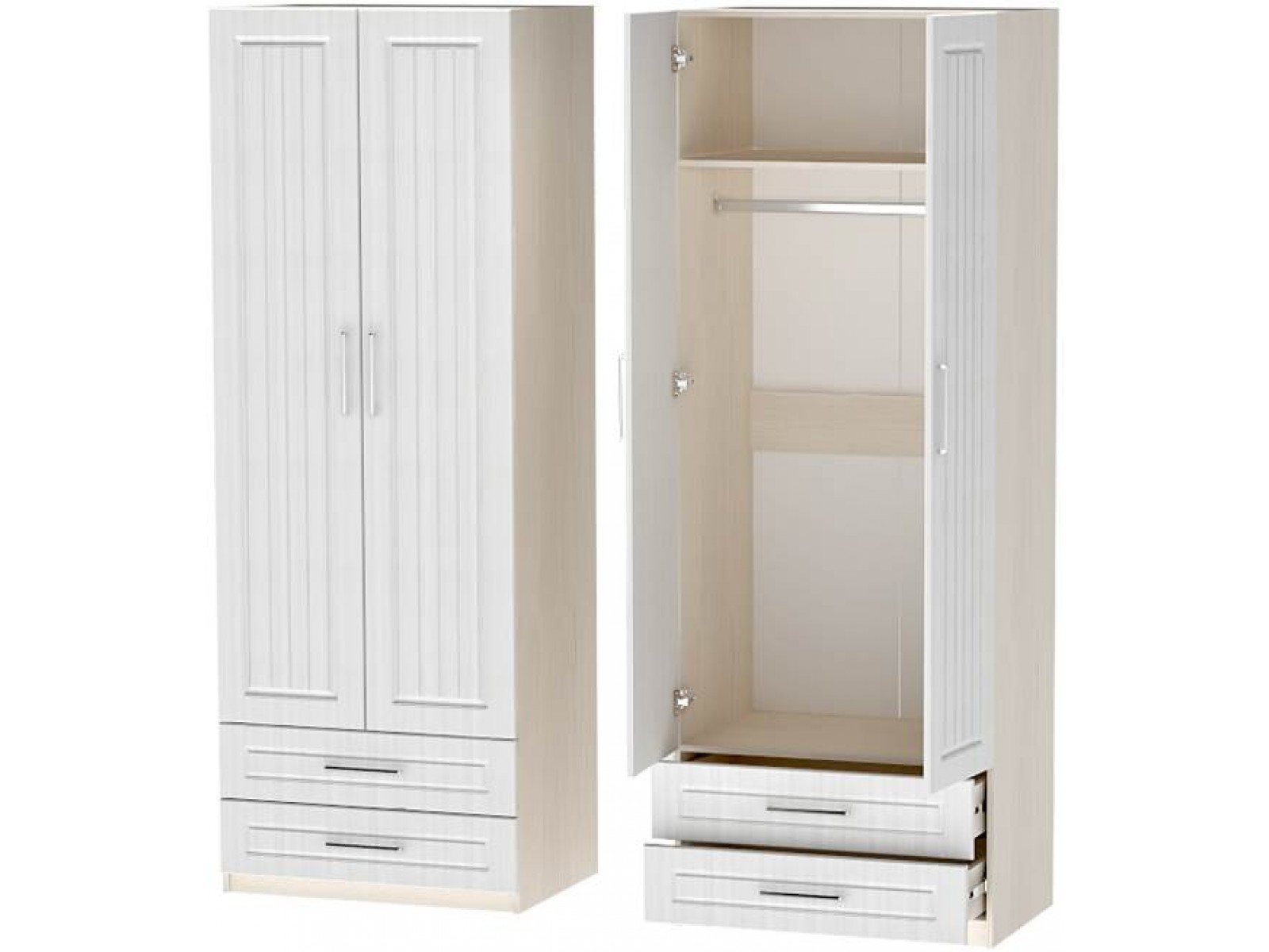 Шкаф двухстворчатый с ящиками довольно хорошо впишется в любой современный интерьер. Его преимущества: хорошая вместимость, компактность, универсальность. За распашными дверями находятся: антресольная полка и металлическая штанга для одежды.