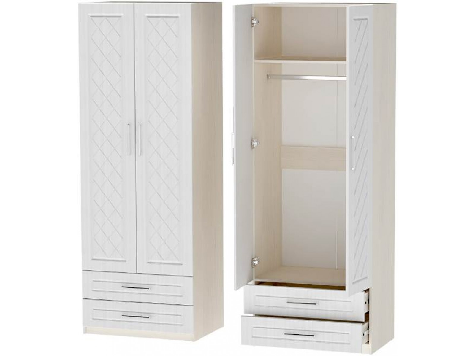 Шкаф двухстворчатый с ящиками довольно хорошо впишется в любой современный интерьер. Его преимущества: хорошая вместимость, компактность, универсальность. За распашными дверями находятся: антресольная полка и металлическая штанга для одежды.
